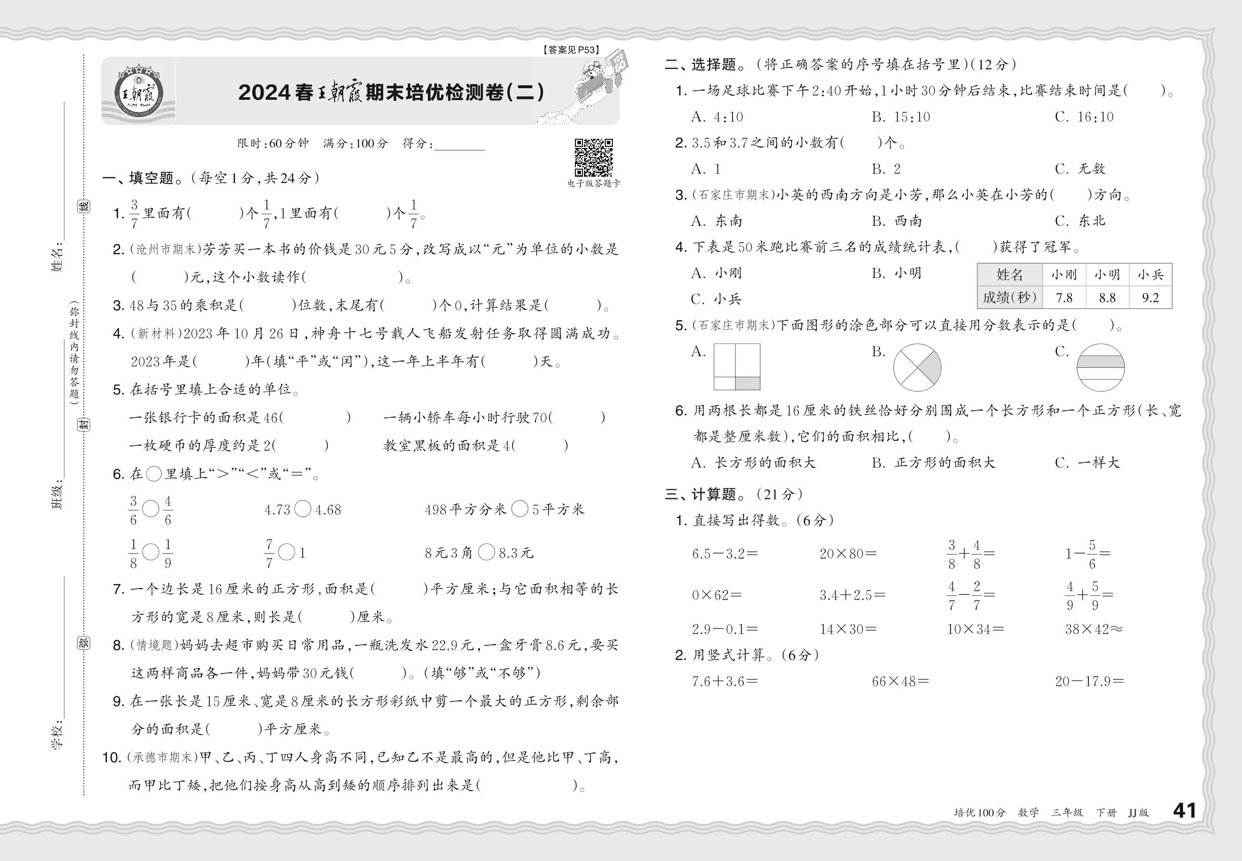 2024春下册三年级数学冀教版 王朝霞期末培优检测卷(二)