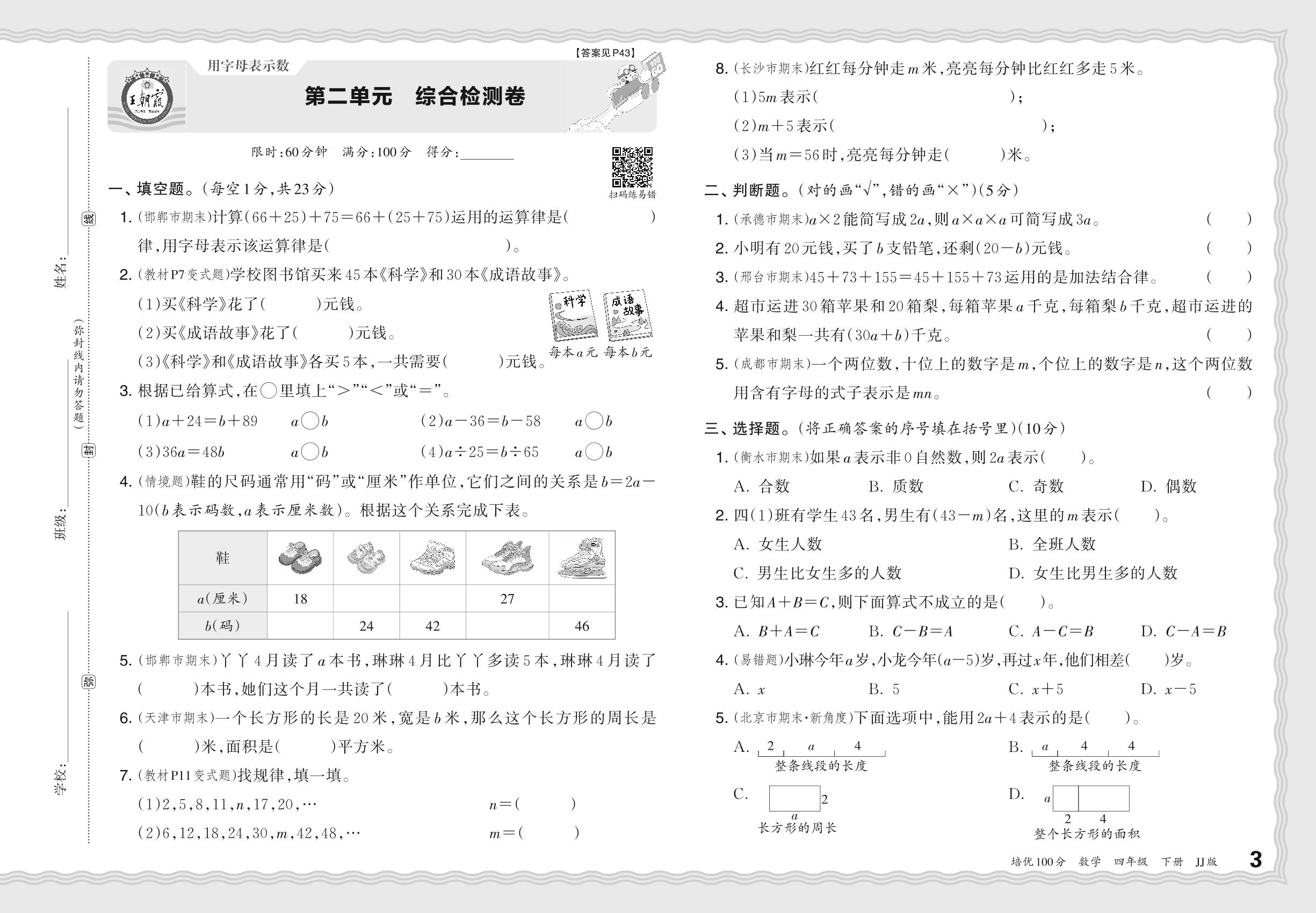 2024春下册四年级数学冀教版 第二单元 综合检测卷