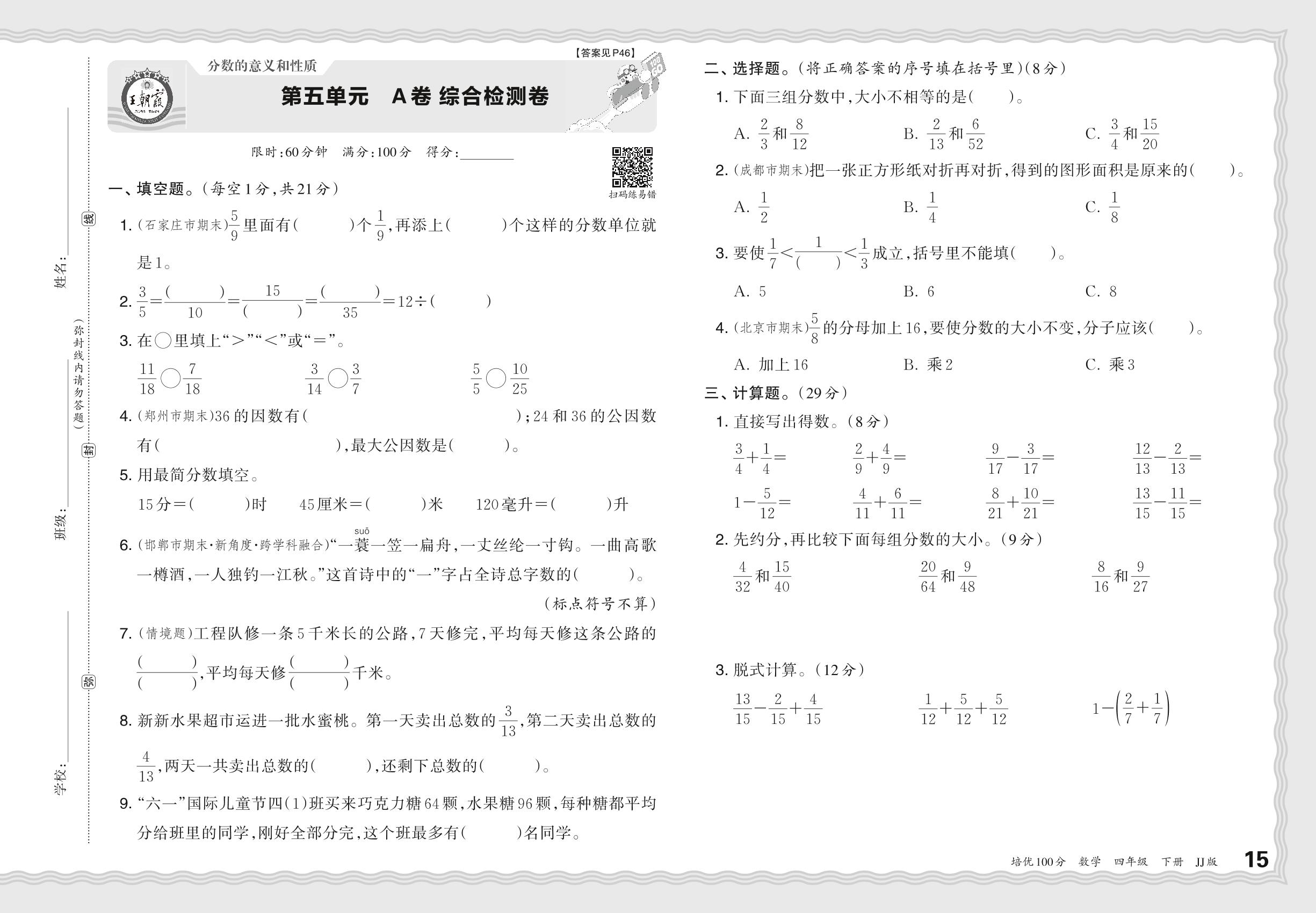 2024春下册四年级数学冀教版 第五单元 A卷 综合检测卷