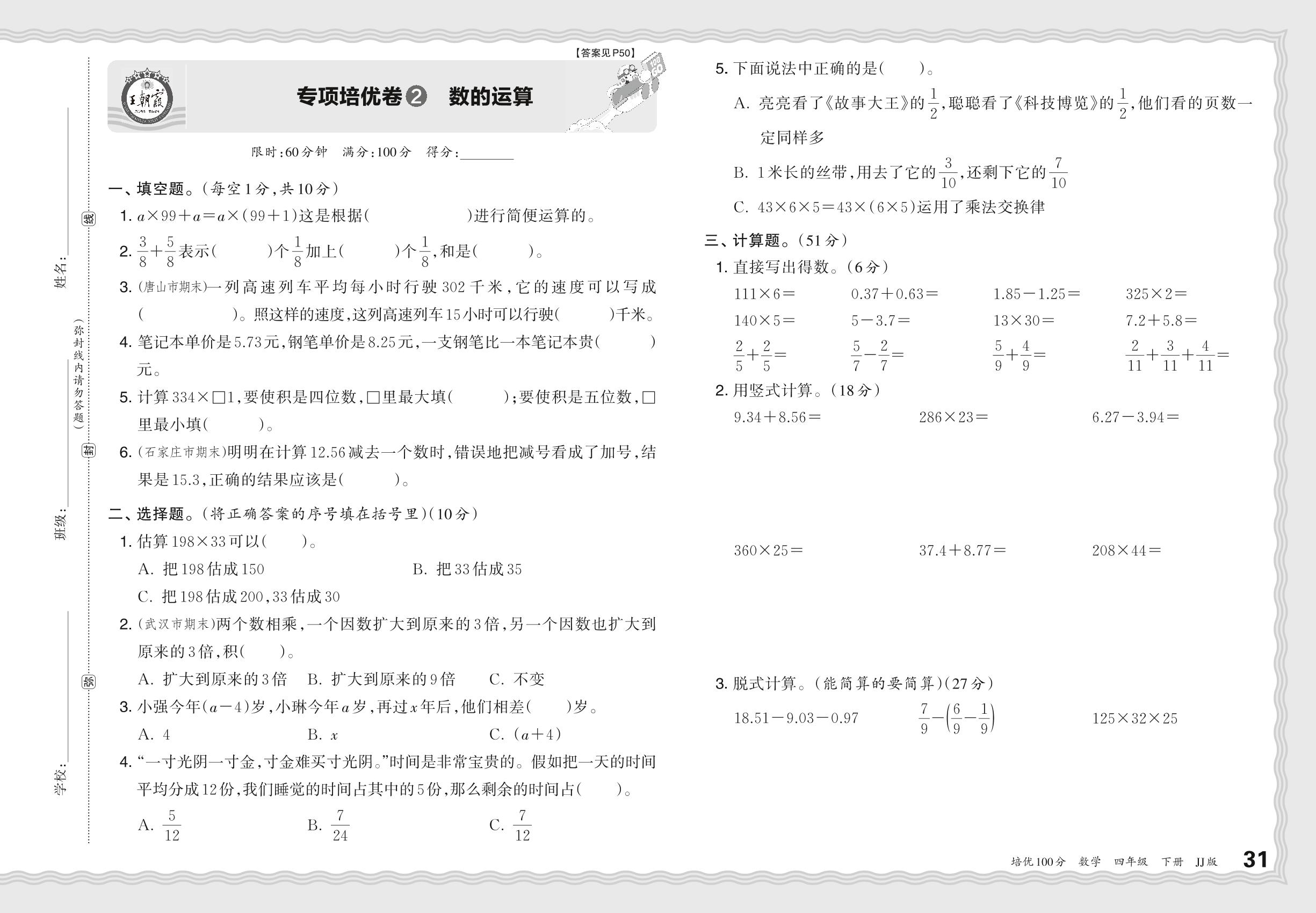 2024春下册四年级数学冀教版 期末专项卷PY版·数的运算【2】