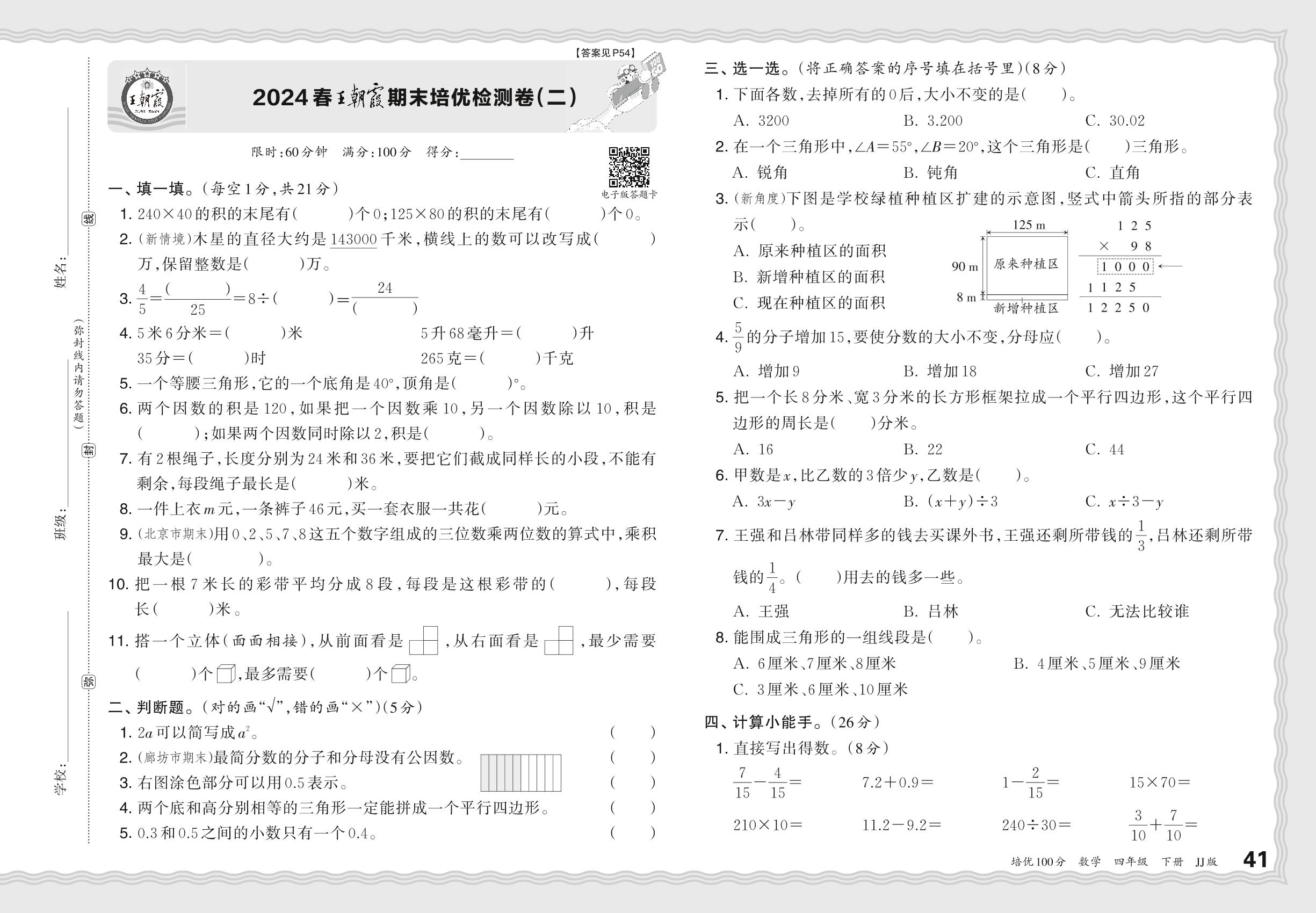 2024春下册四年级数学冀教版 王朝霞期末培优检测卷(二)