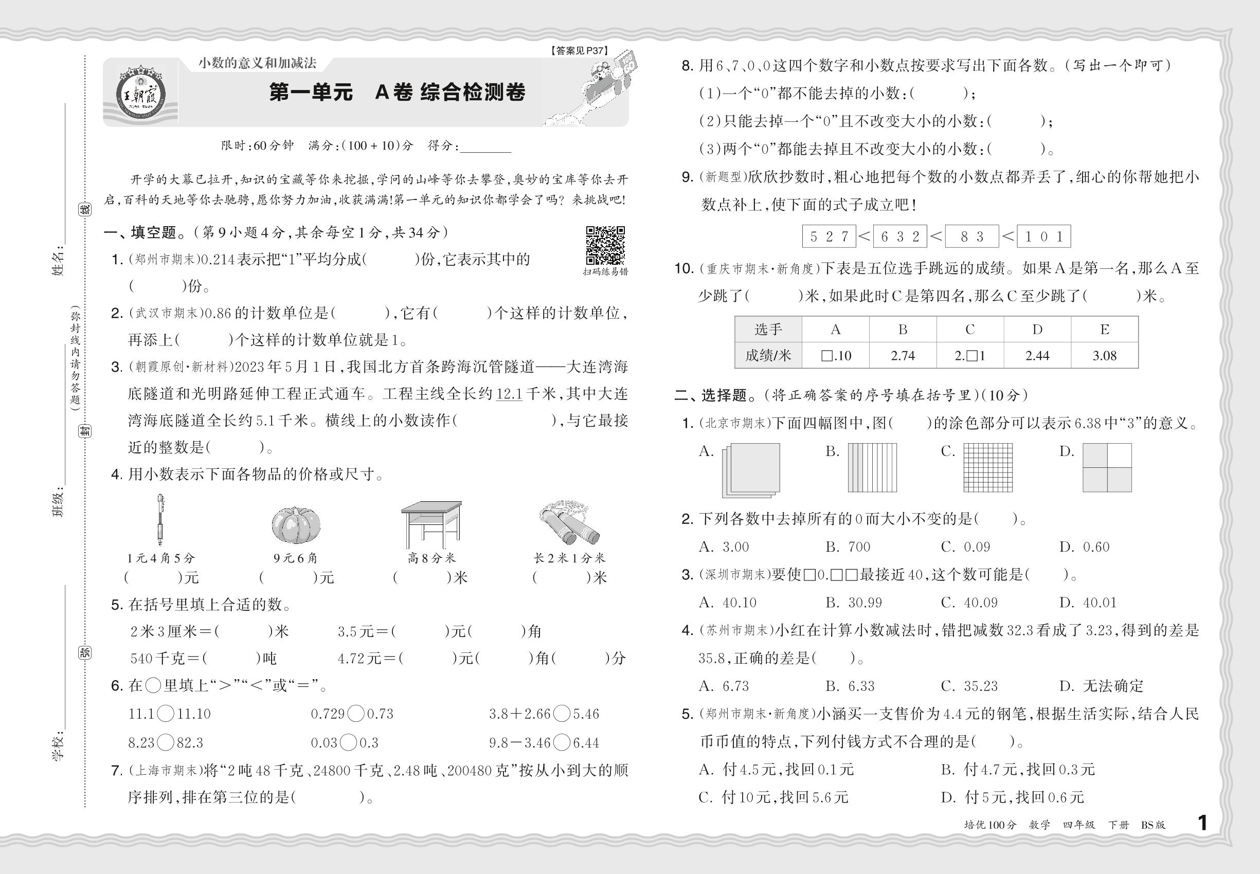 2024春下册四年级数学北师版 第一单元 A卷 综合检测卷