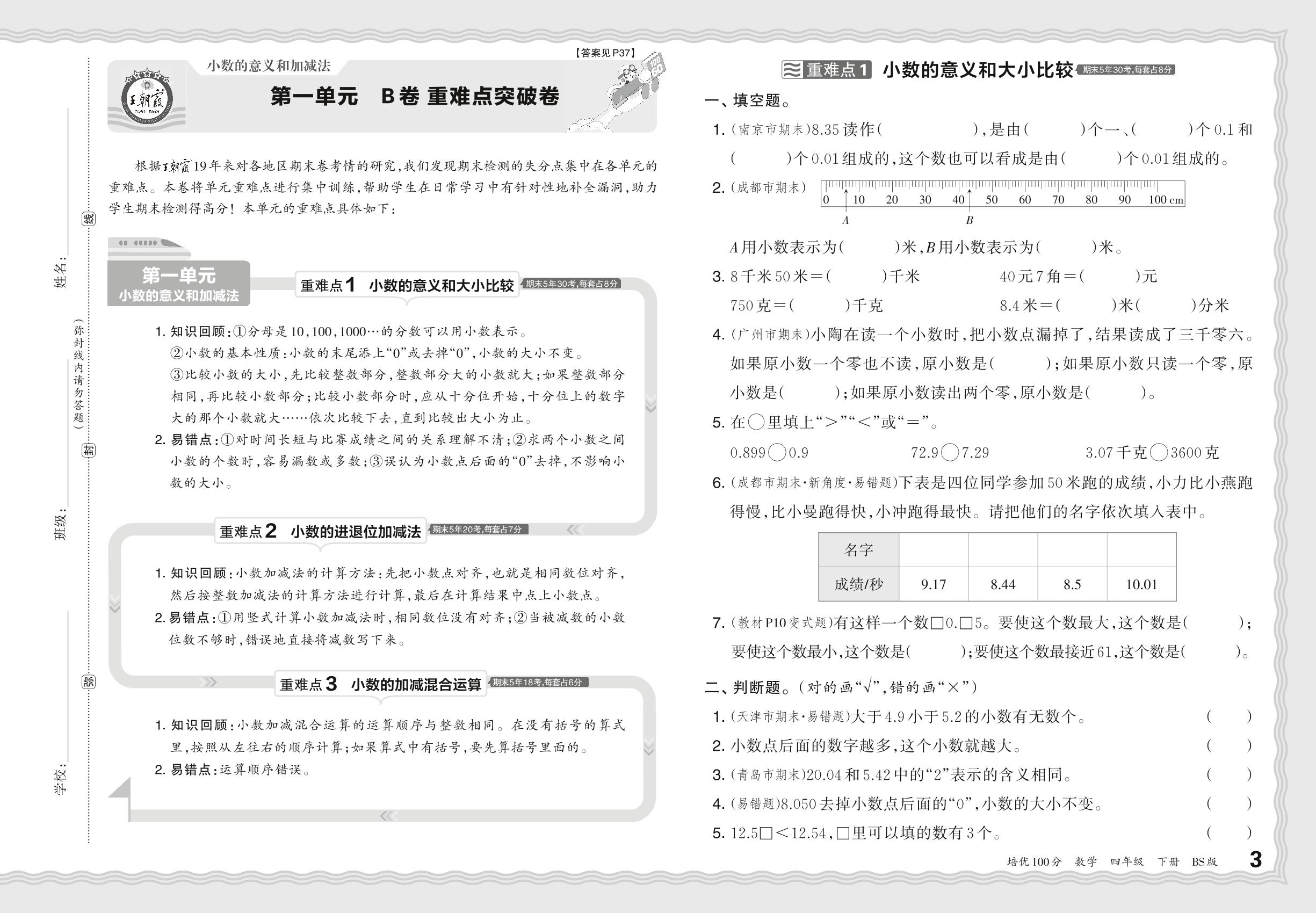 2024春下册四年级数学北师版 第一单元 B卷 重难点突破卷