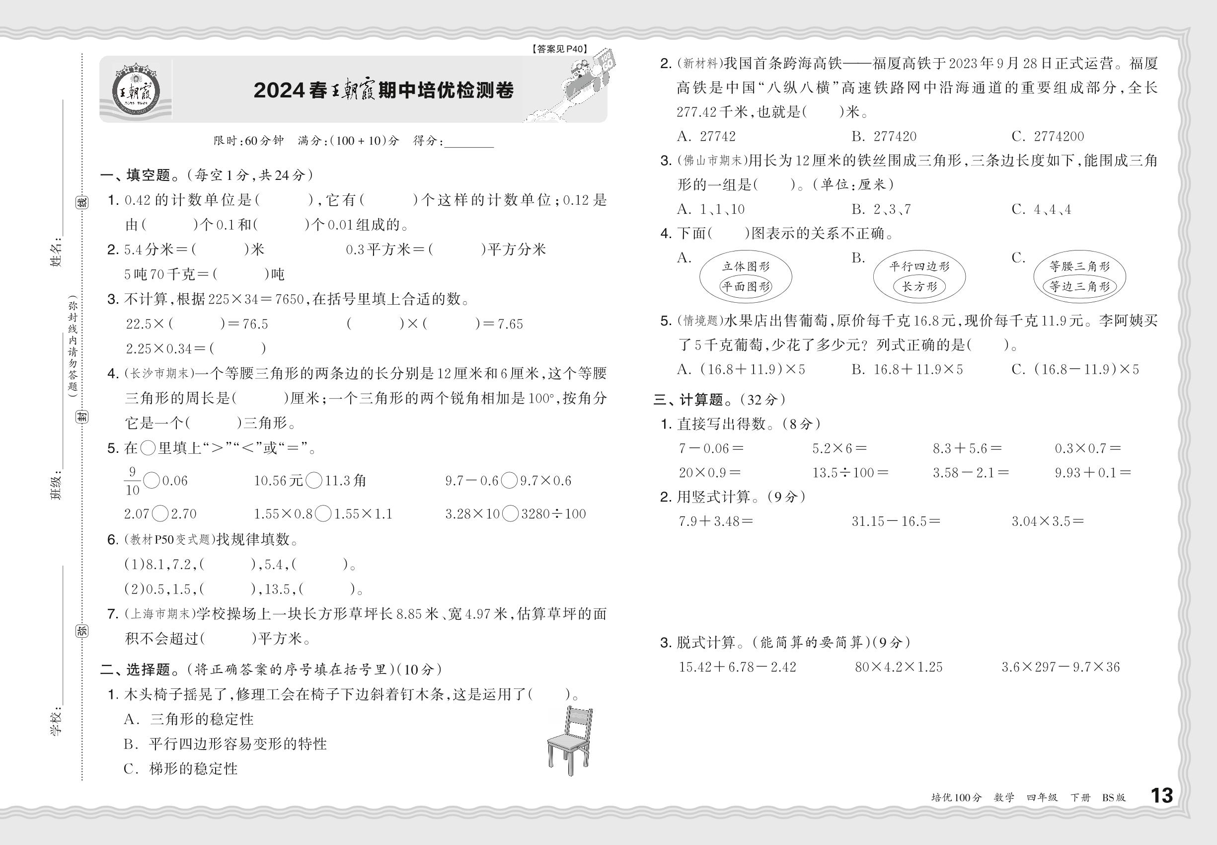 2024春下册四年级数学北师版 王朝霞期中培优检测卷