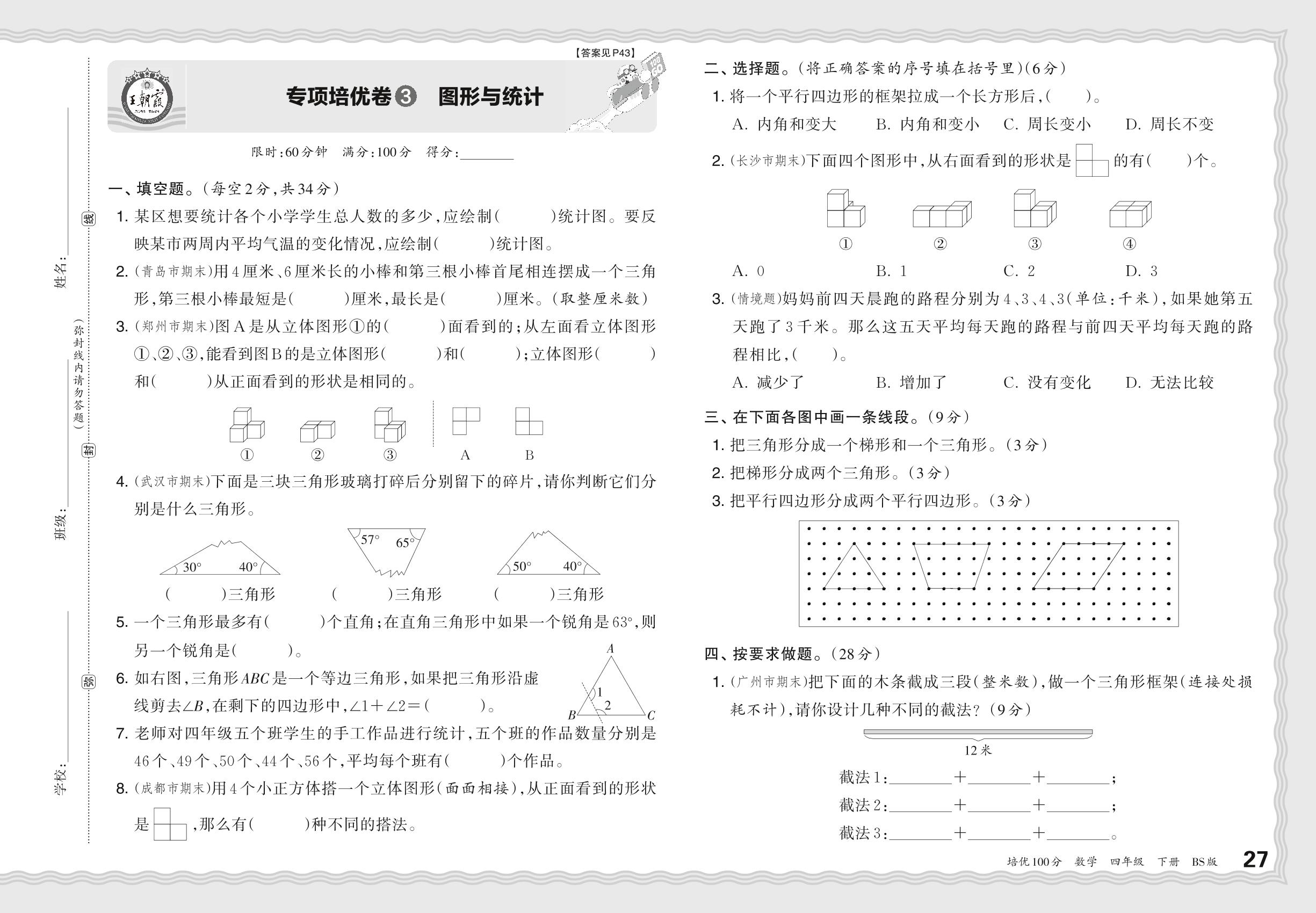2024春下册四年级数学北师版 期末专项卷PY版·图形与统计【3】