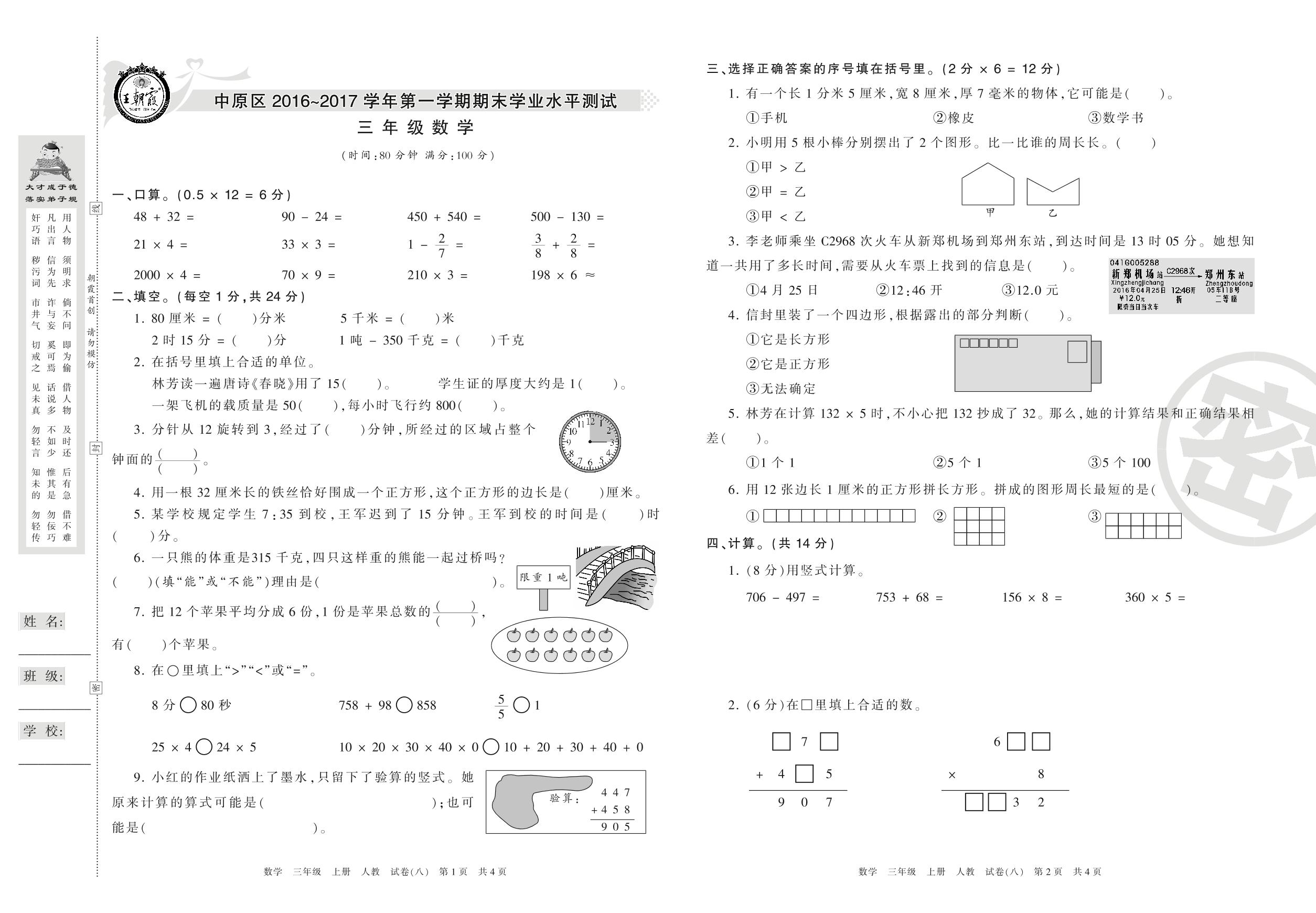 2016-2017学年第一学期郑州市郑汴专版中原区三年级数学试卷(人教版)【8】