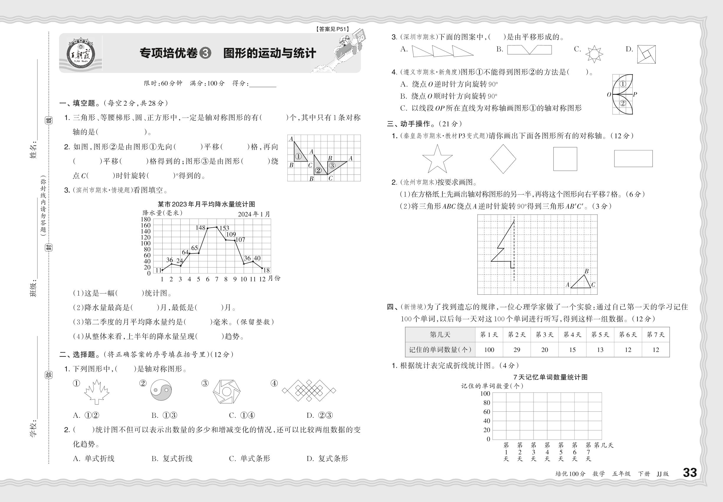 2024春下册五年级数学冀教版 期末专项卷PY版·图形的运动与统计【3】