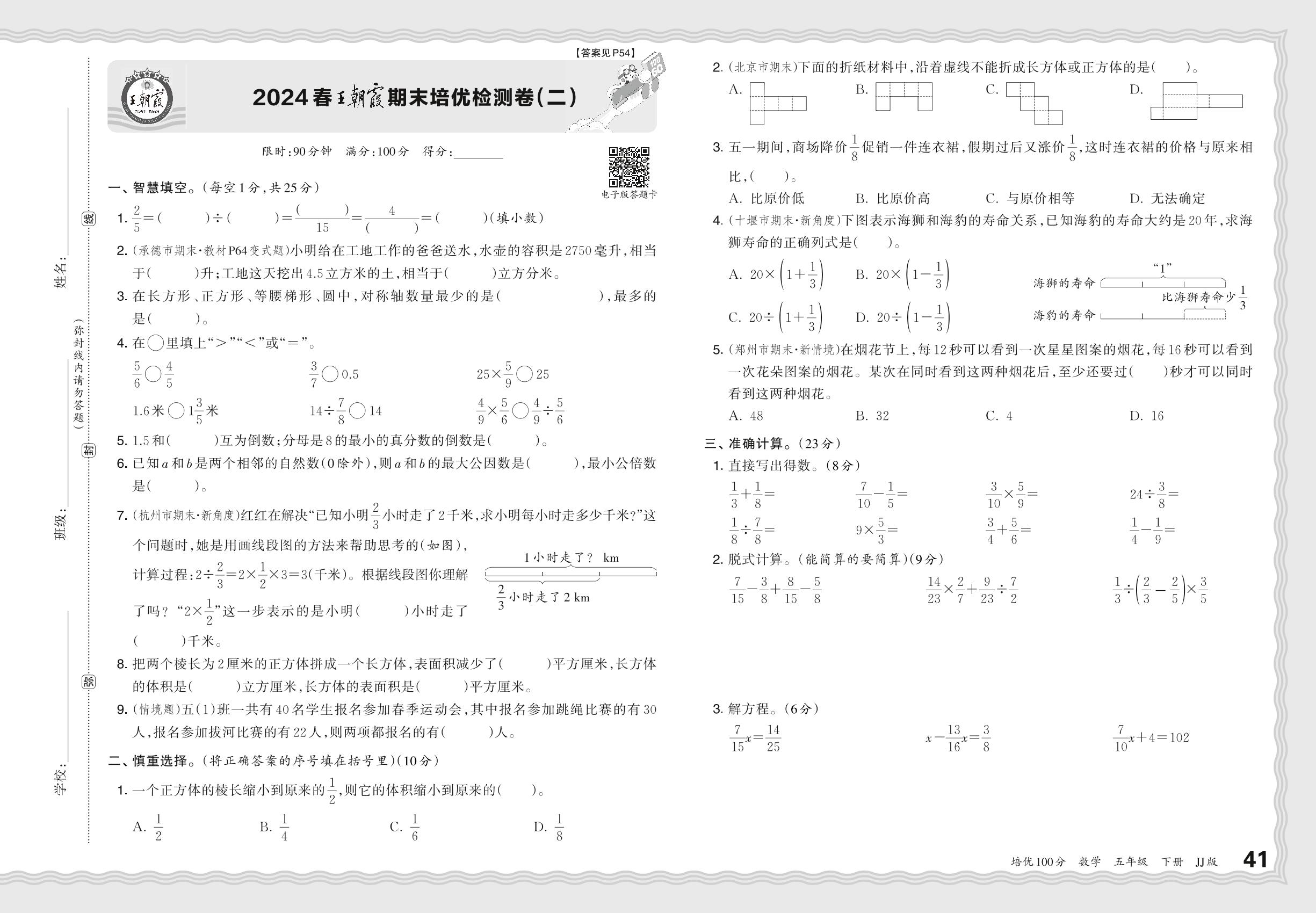2024春下册五年级数学冀教版 王朝霞期末培优检测卷(二)