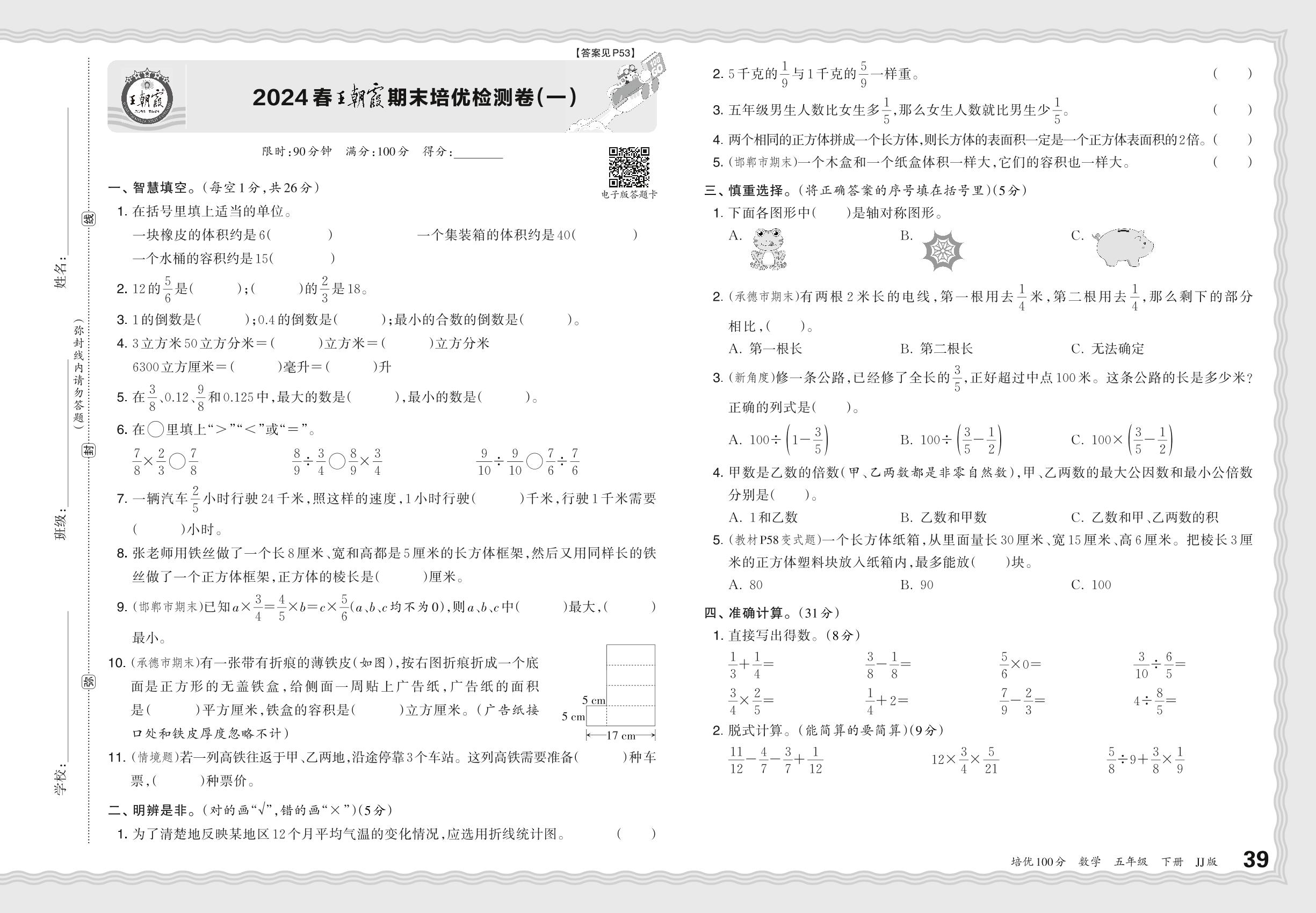 2024春下册五年级数学冀教版 王朝霞期末培优检测卷(一)