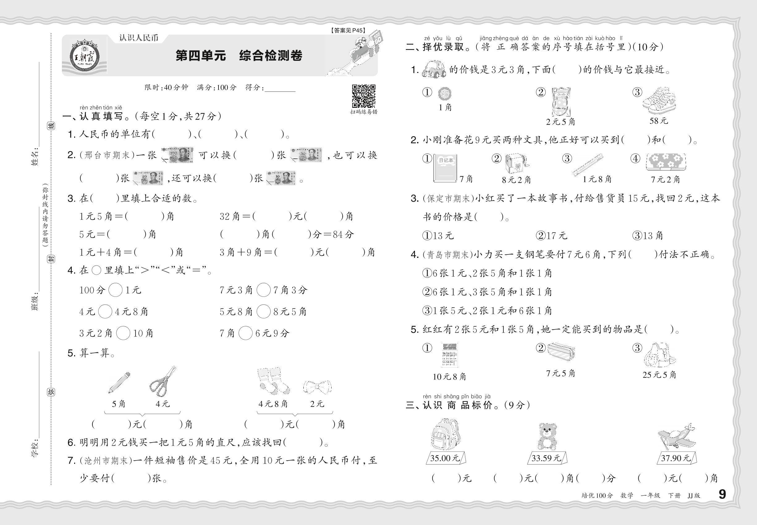 2024春下册一年级数学冀教版 第四单元 综合检测卷