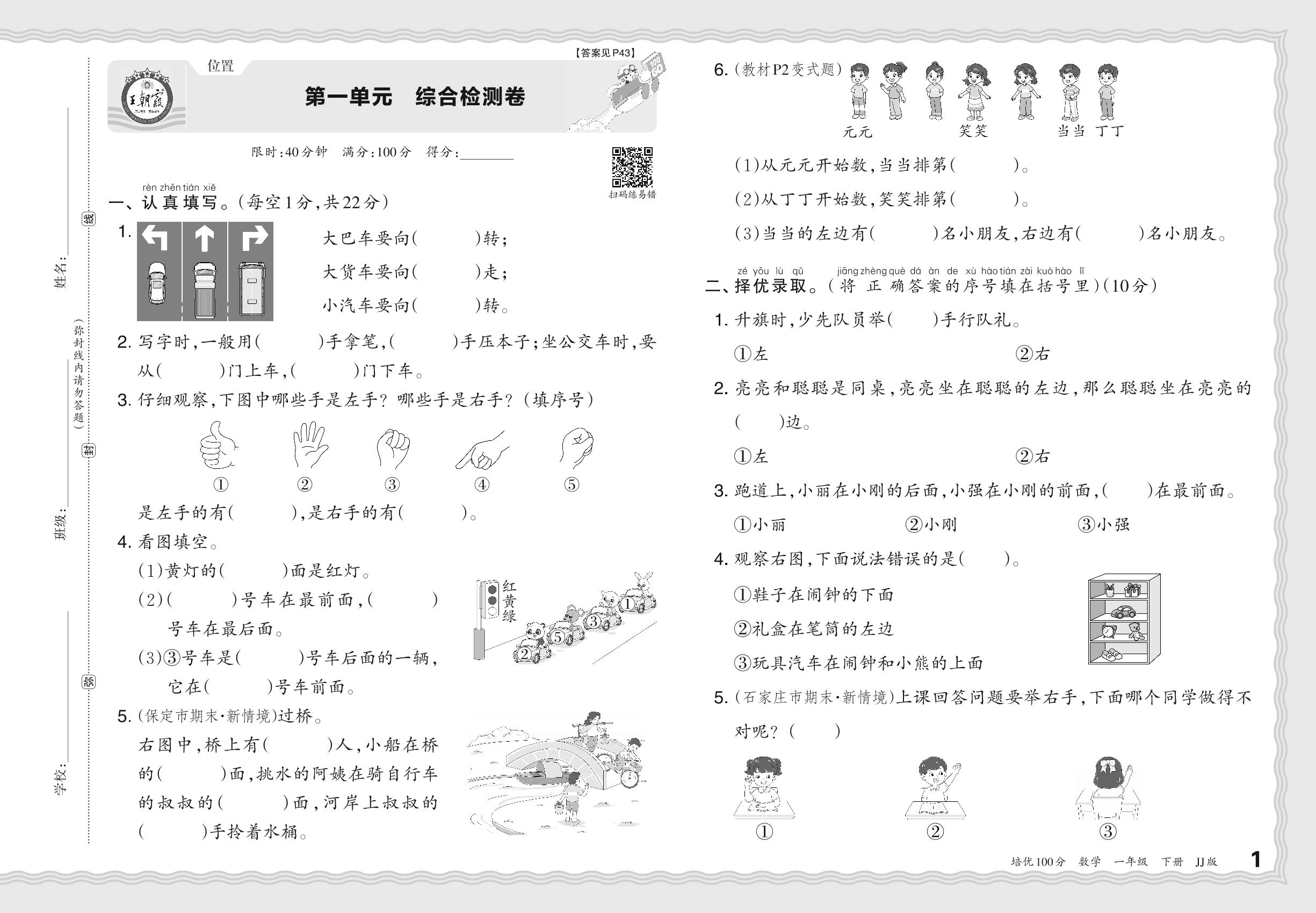 2024春下册一年级数学冀教版 第一单元 综合检测卷
