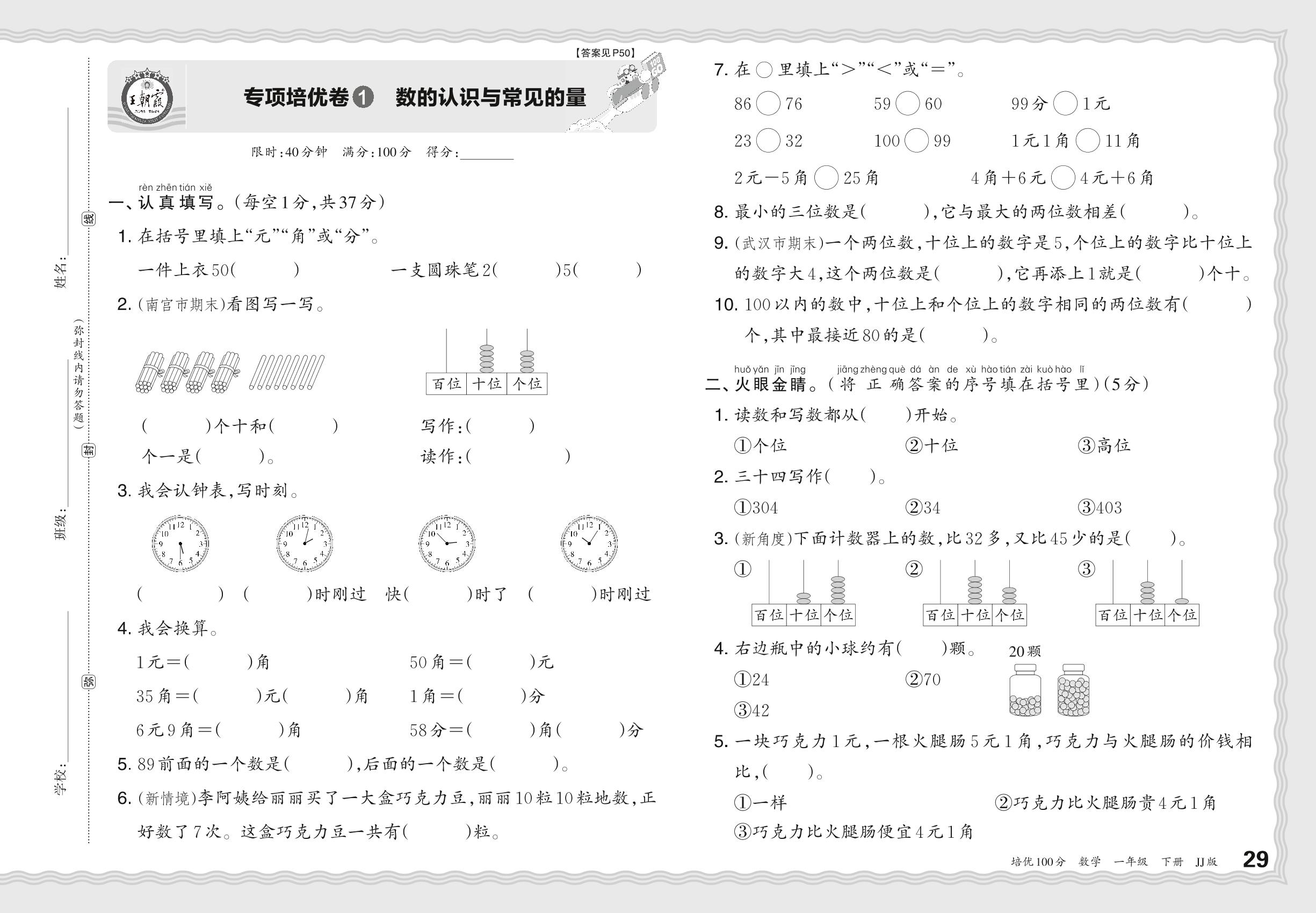 2024春下册一年级数学冀教版 期末专项卷PY版·数的认识与常见的量【1】