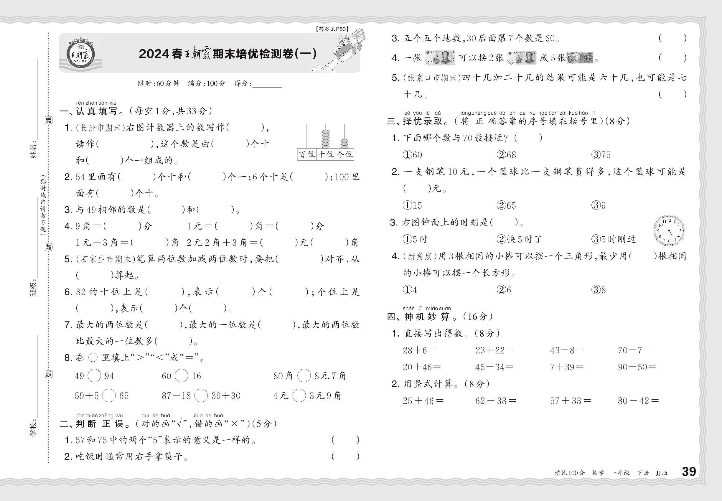 2024春下册一年级数学冀教版 王朝霞期末培优检测卷(一)