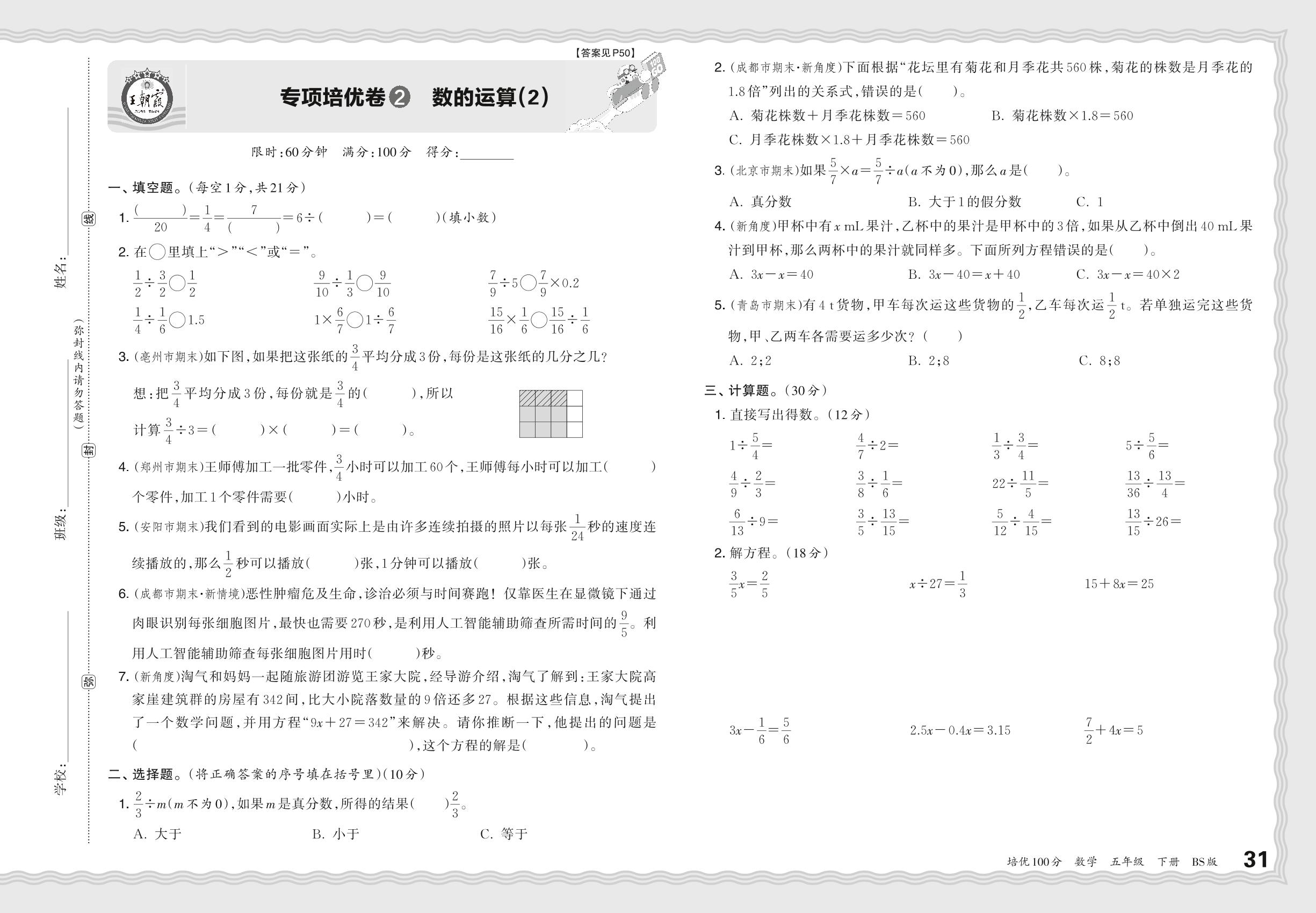 2024春下册五年级数学北师版 期末专项卷PY版·数的运算(2)【2】