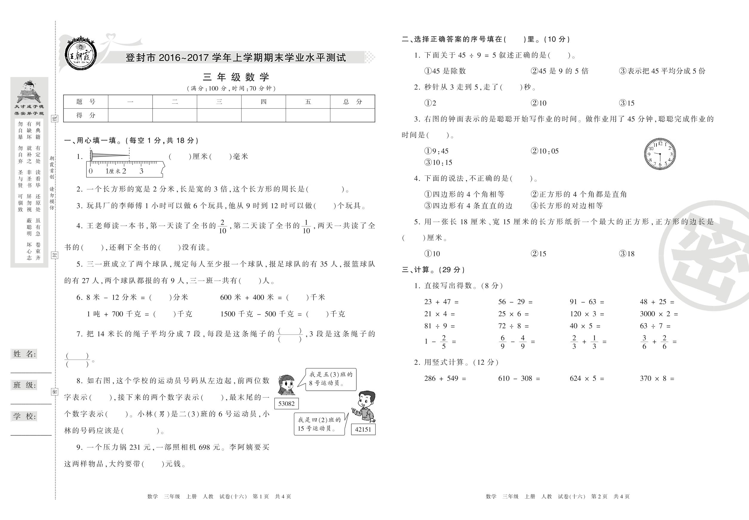 2016-2017学年第一学期登封市三年级数学试卷(人教版)【16】