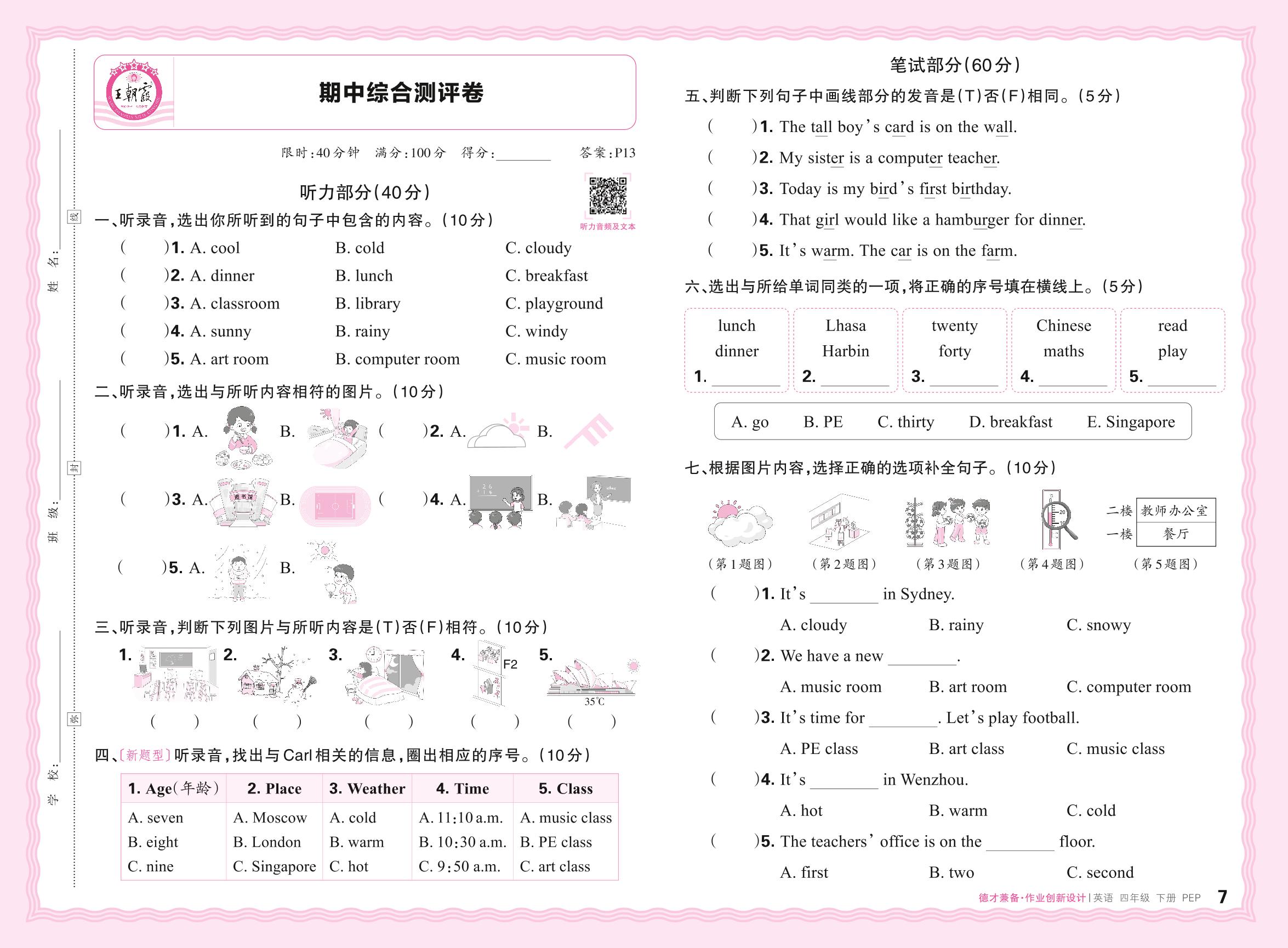 2024春下册四年级英语人教PEP版 期中综合测评卷