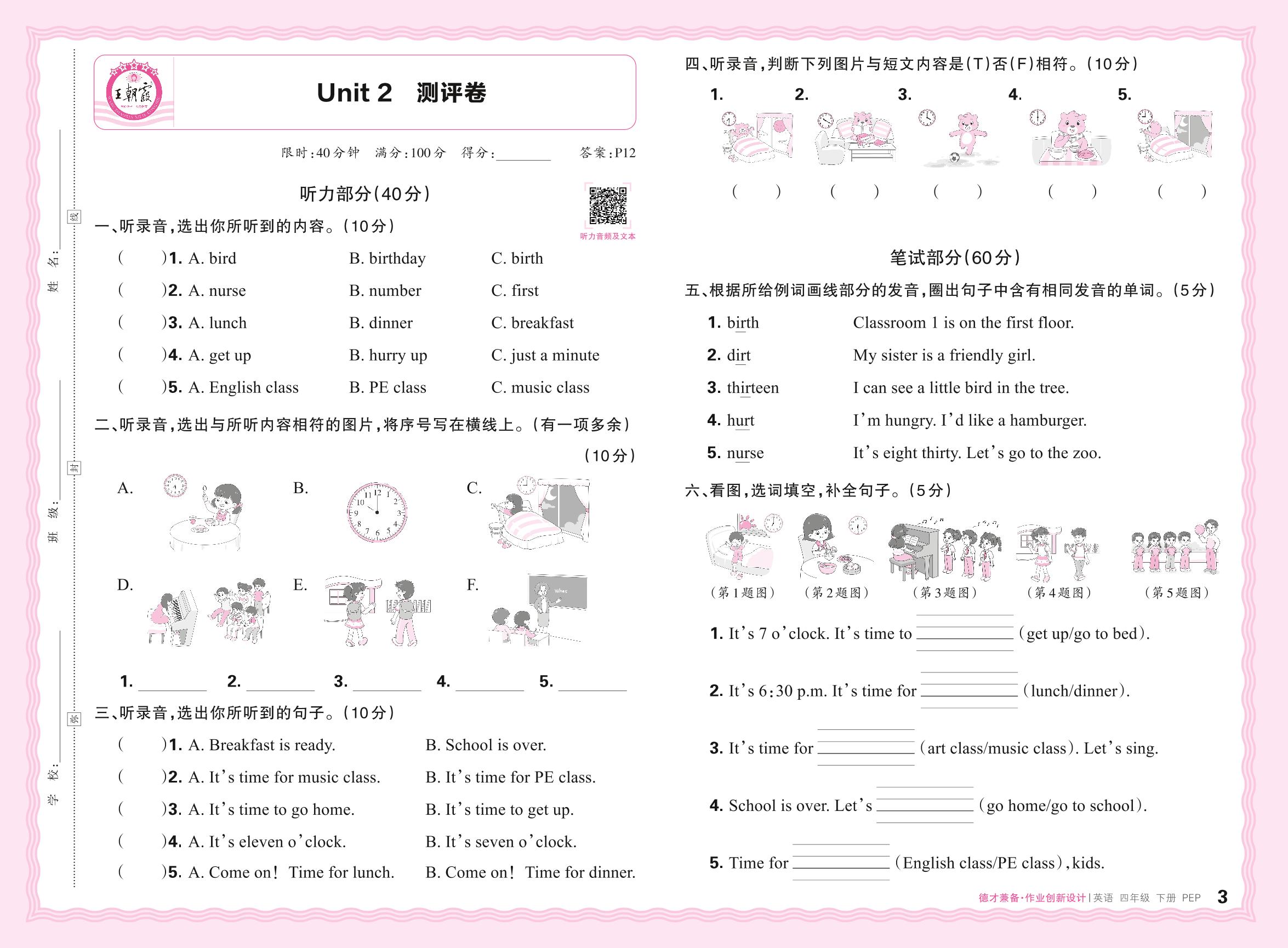 2024春下册四年级英语人教PEP版 Unit 2 测评卷