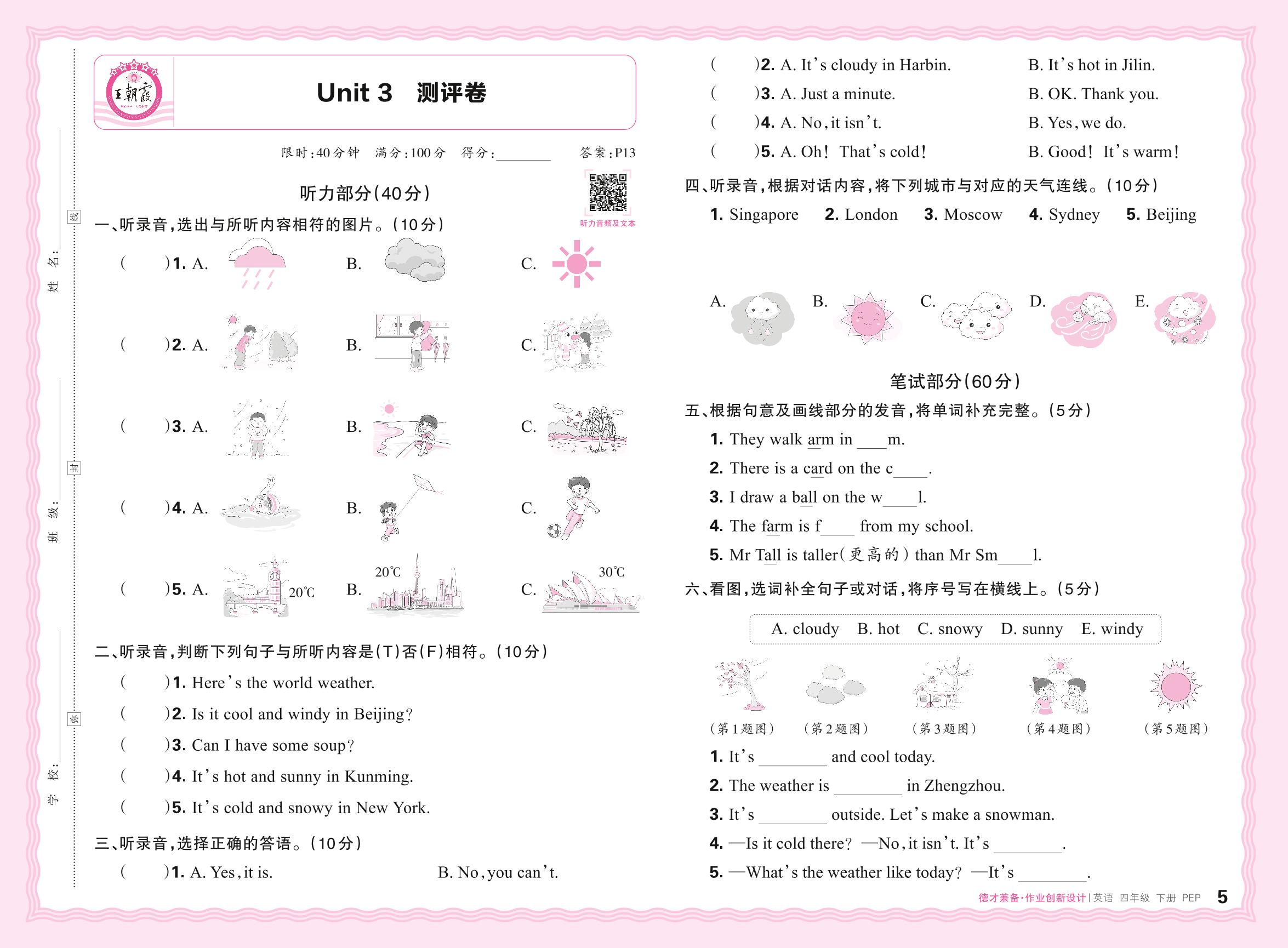 2024春下册四年级英语人教PEP版 Unit 3 测评卷