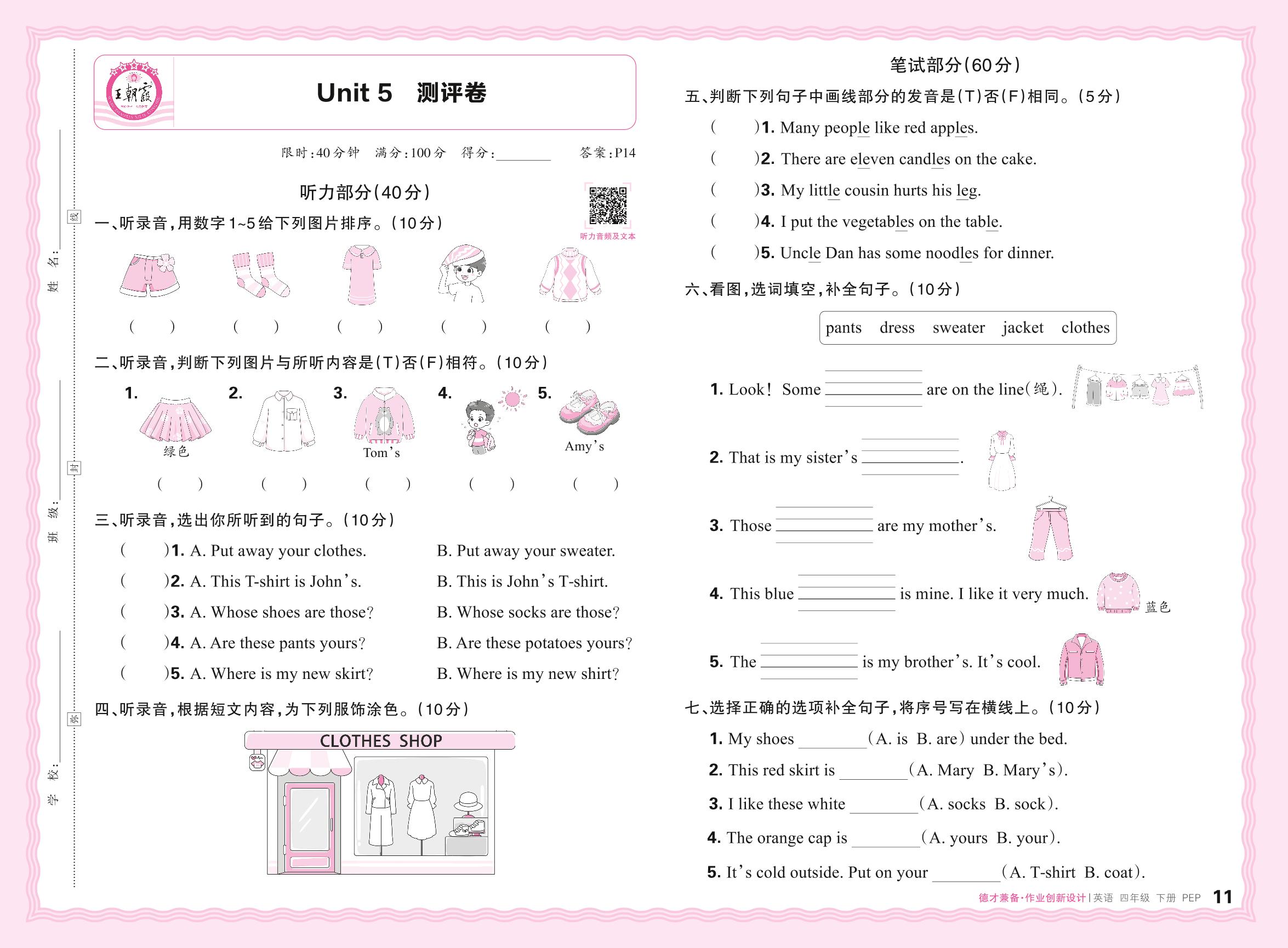 2024春下册四年级英语人教PEP版 Unit 5 测评卷
