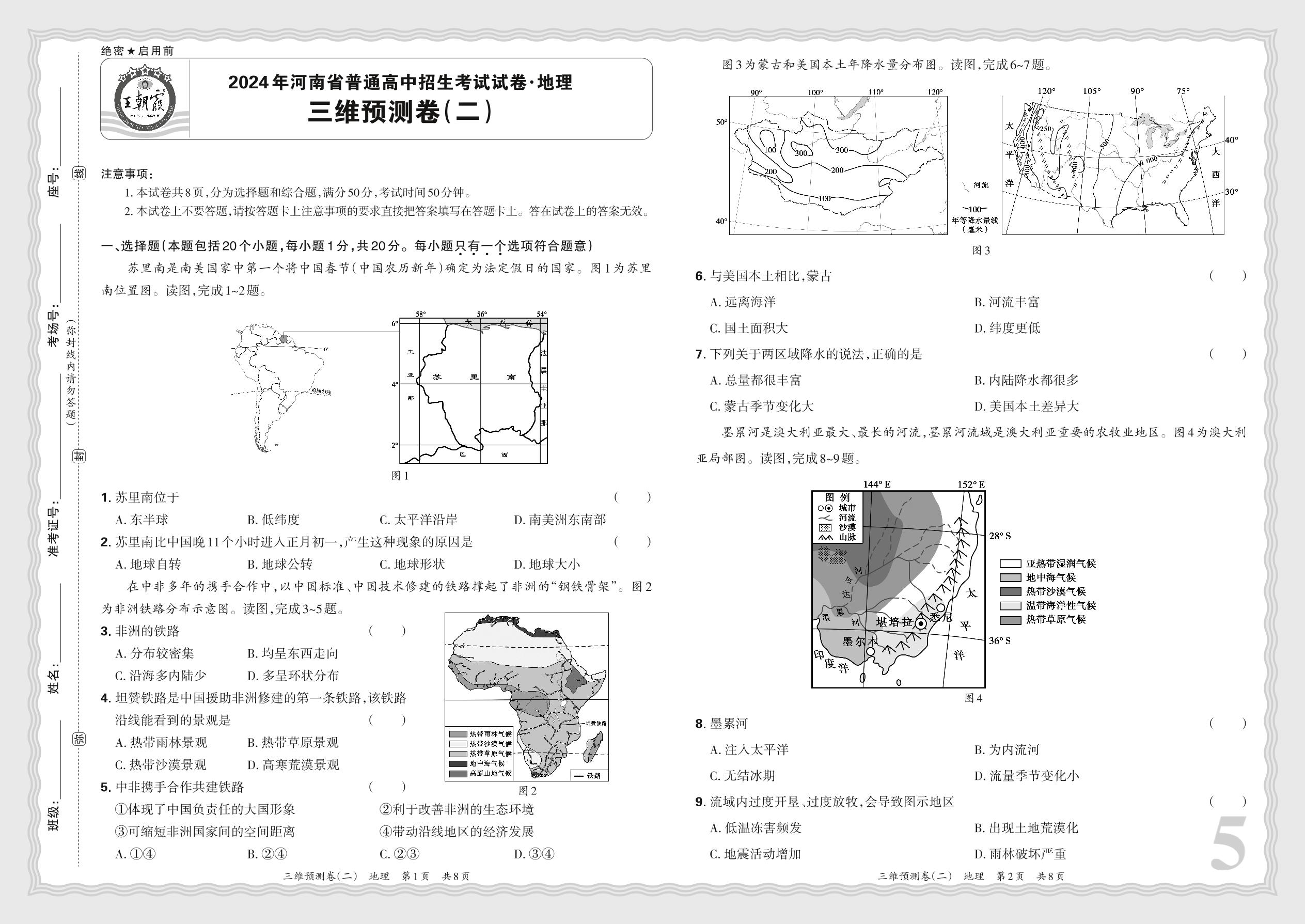 2024年河南省普通高中招生考试试卷·地理 三维预测卷(二)