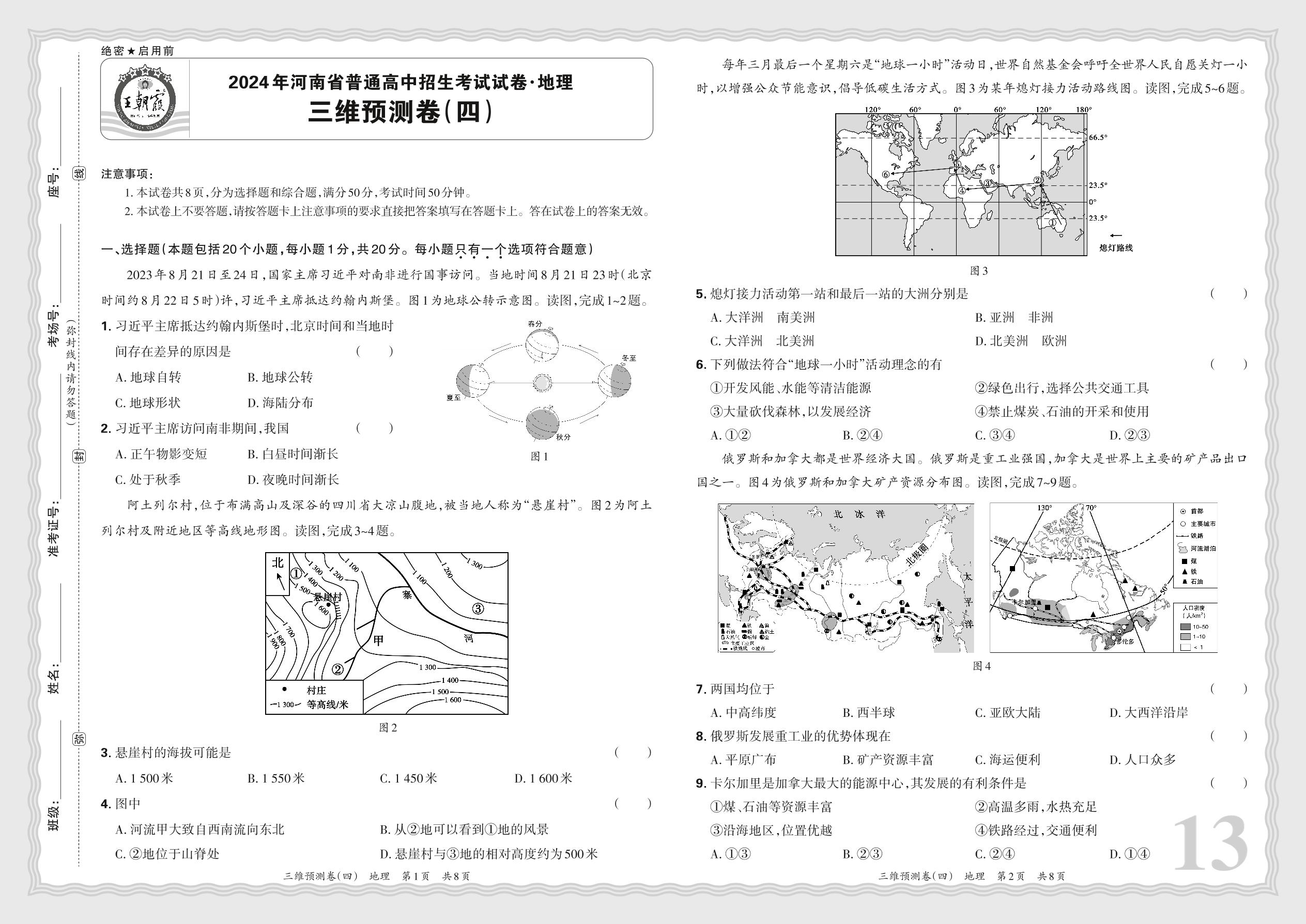 2024年河南省普通高中招生考试试卷·地理 三维预测卷(四)