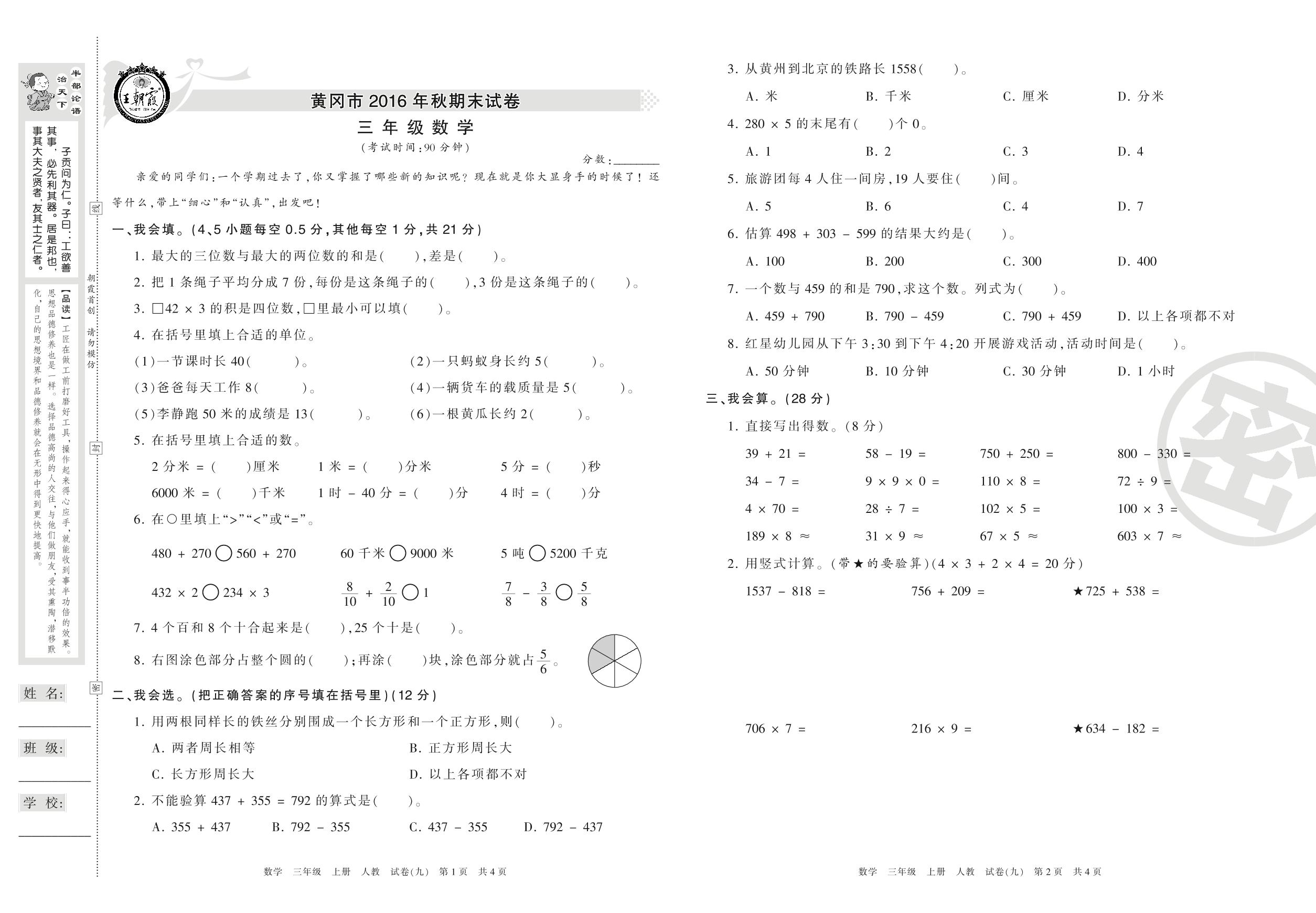 2016-2017学年第一学期黄冈市三年级数学试卷(人教版)【9】