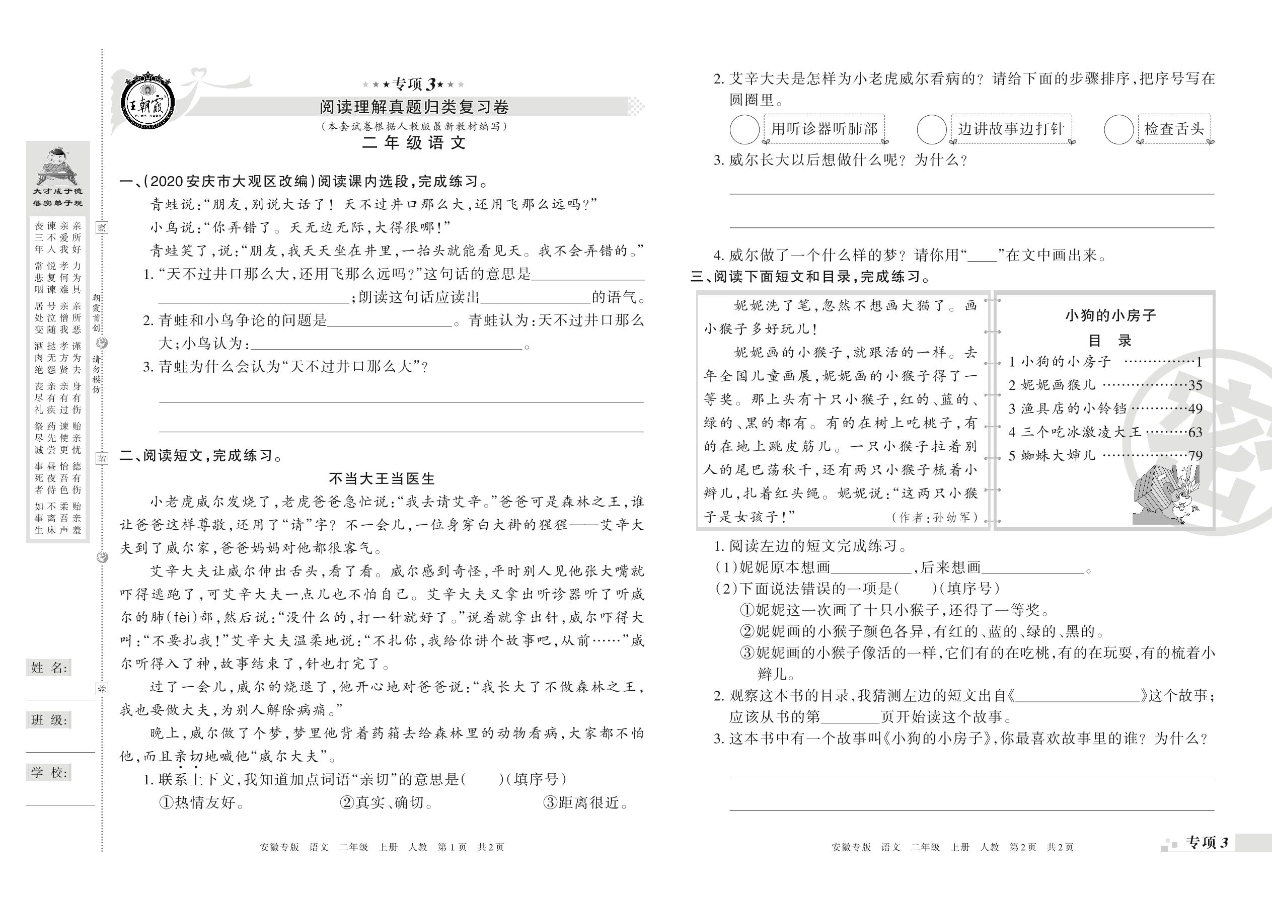 王朝霞期末专项卷——阅读理解、写话真题归类复习二年级上册语文(人教版)_R21080164901【0】