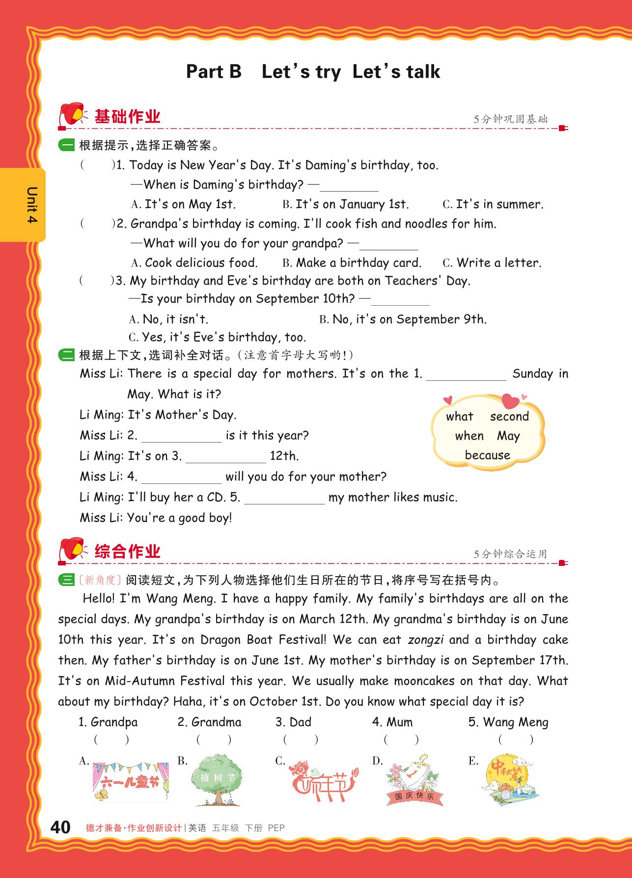 2024春下册五年级英语人教PEP版 Unit 4—Part B Let’s try Let’s talk