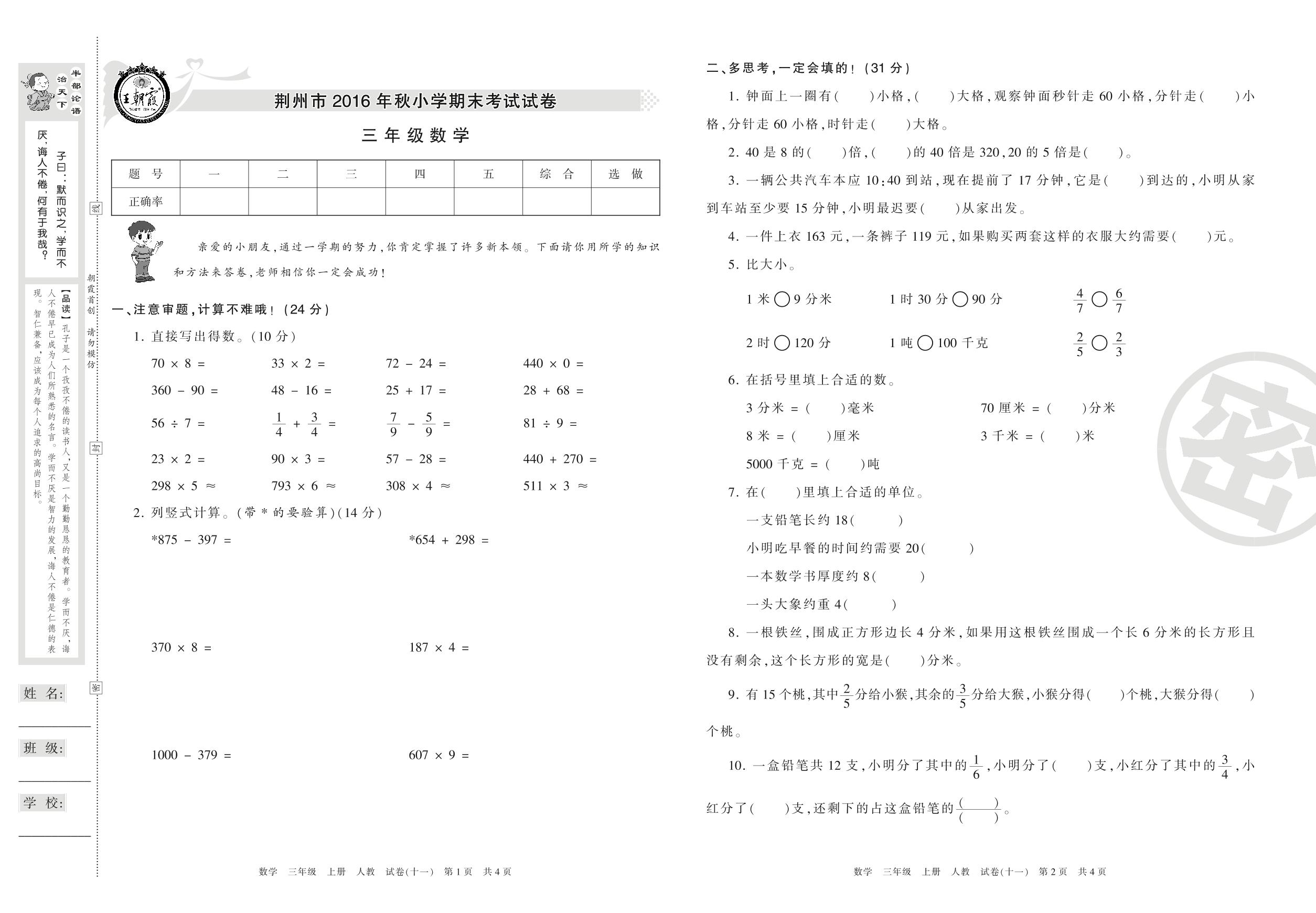 2016-2017学年第一学期荆州市三年级数学试卷(人教版)【11】