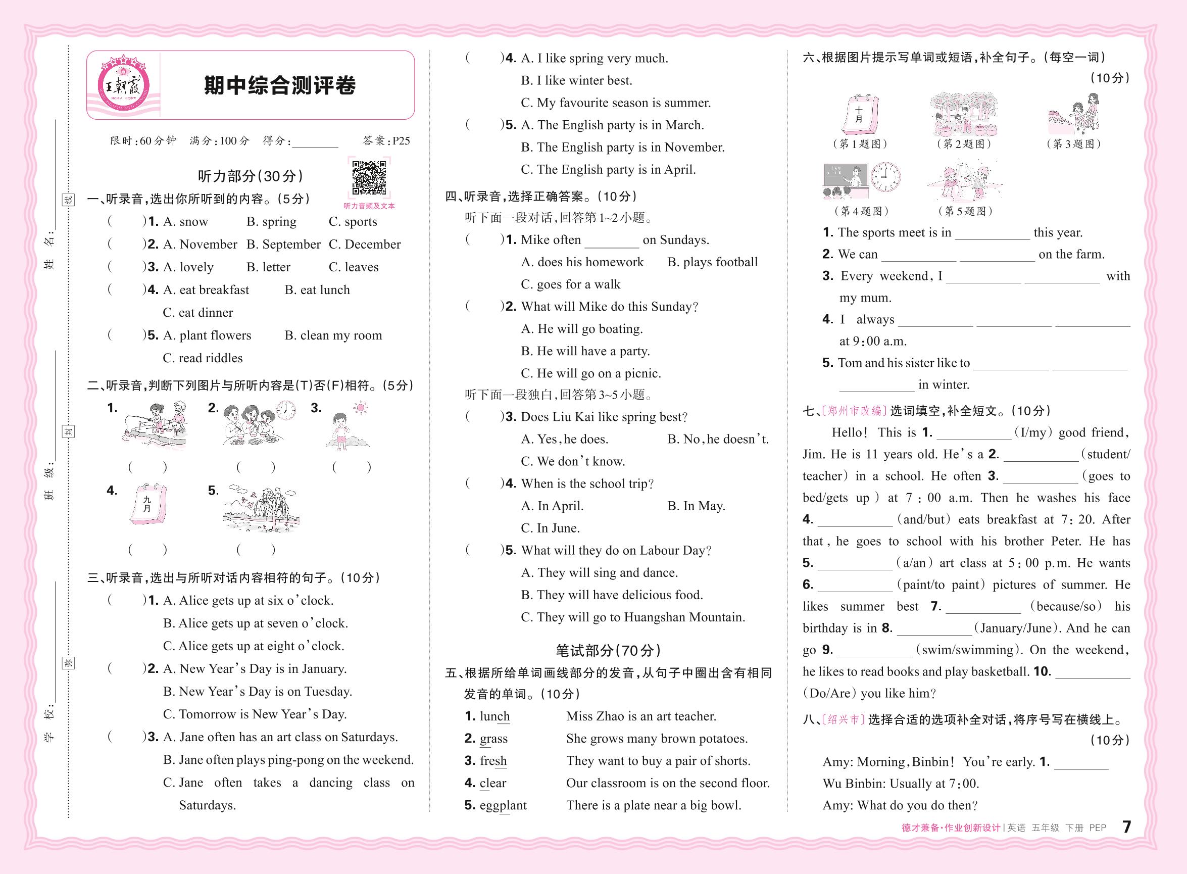 五年级英语人教PEP版(三起始)下册期中卷