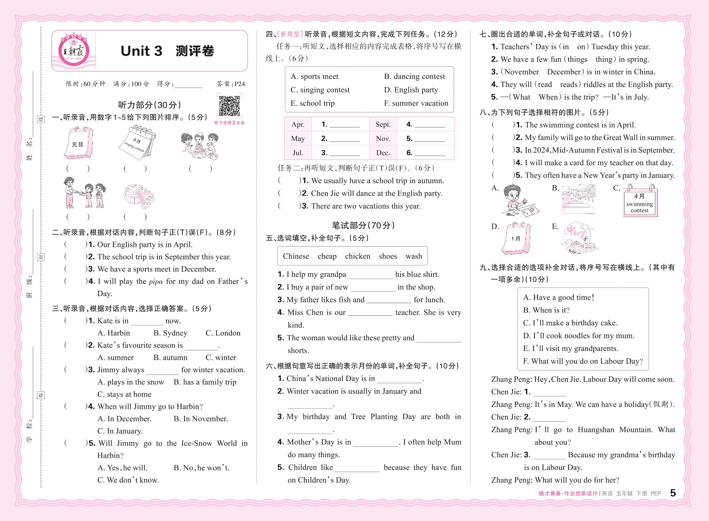 五年级英语人教PEP版(三起始)下册单元卷