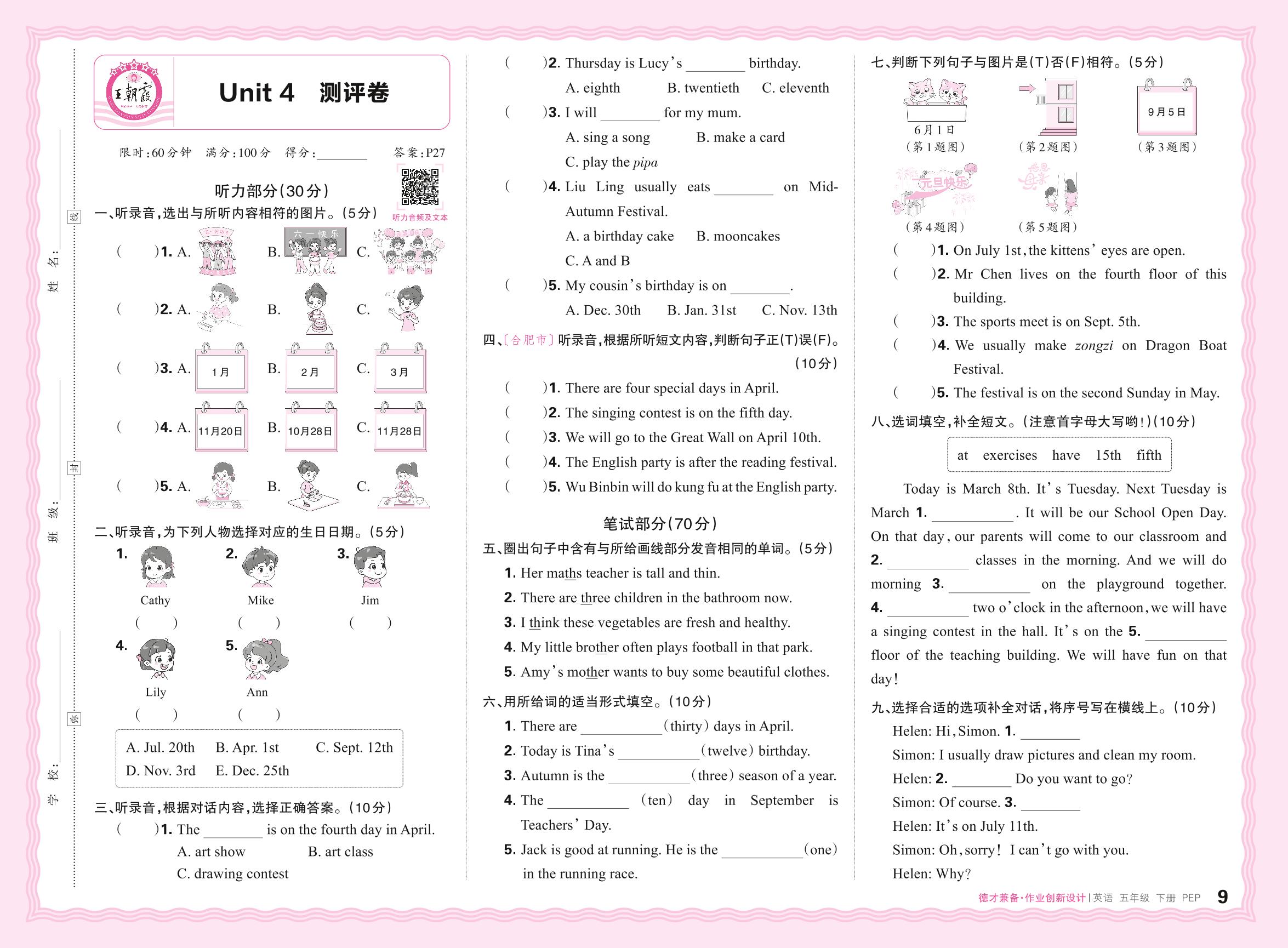 2024春下册五年级英语人教PEP版 Unit 4 测评卷