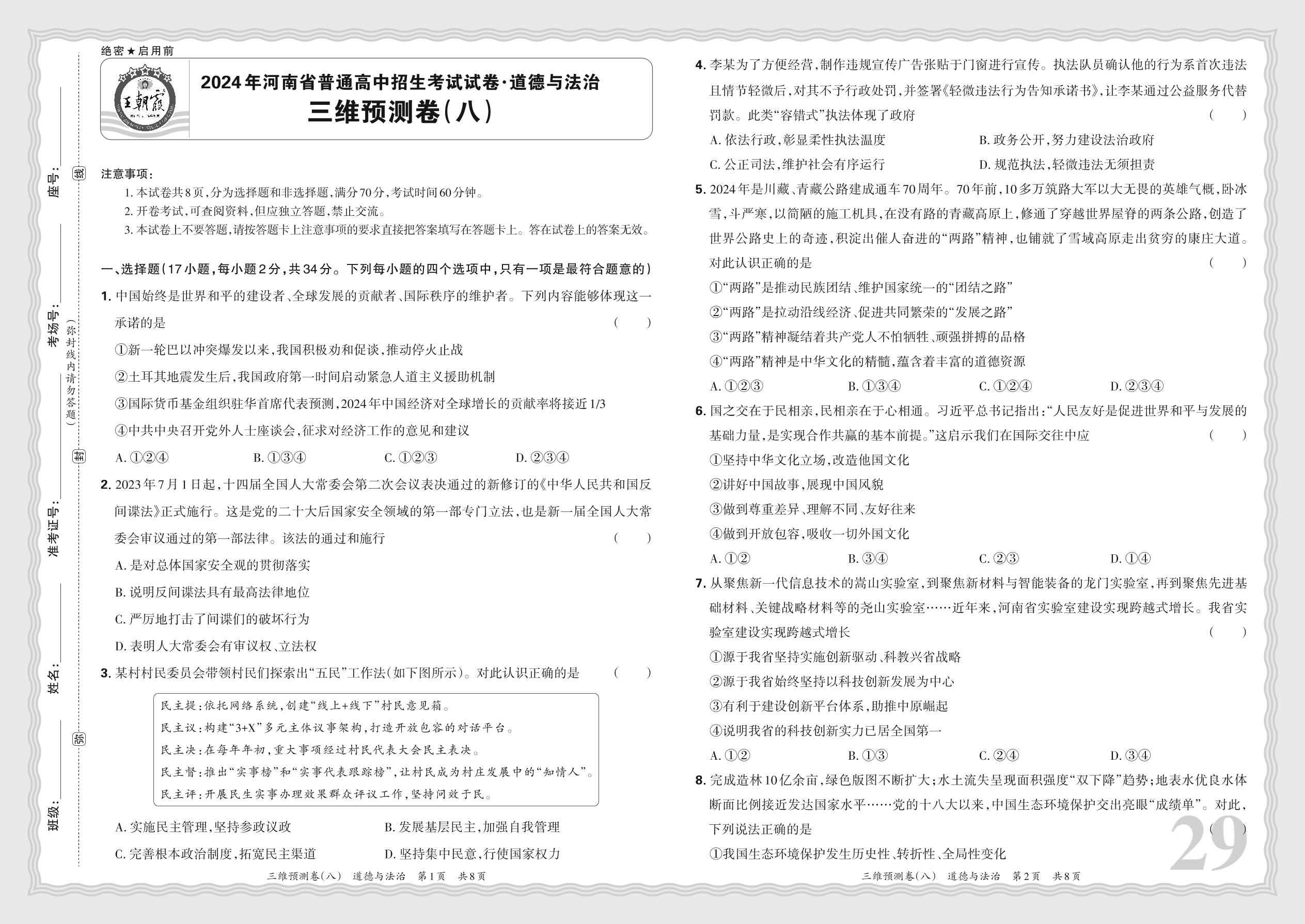 2024年河南省普通高中招生考试试卷·道德与法治 三维预测卷(八)