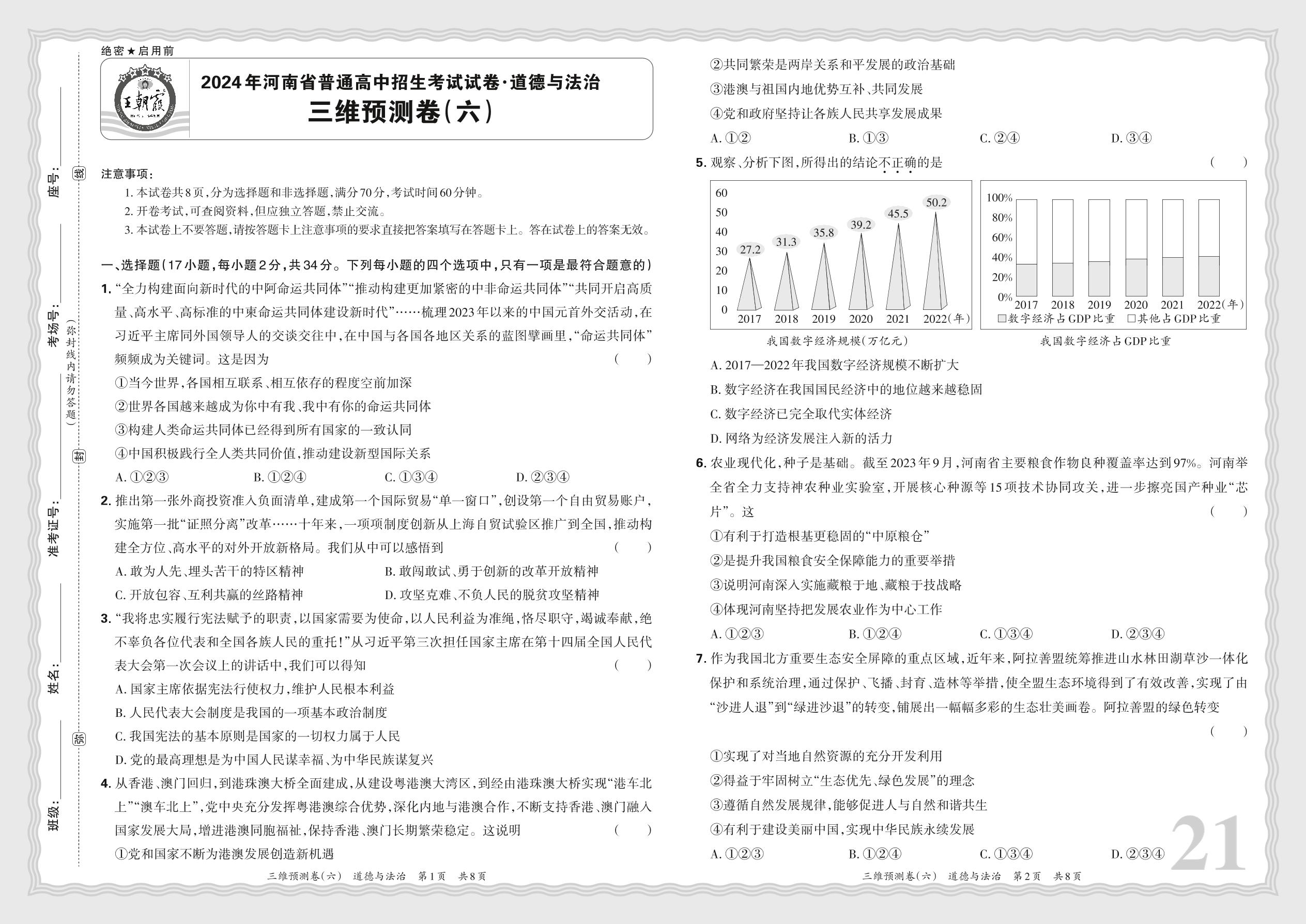 2024年河南省普通高中招生考试试卷·道德与法治 三维预测卷(六)