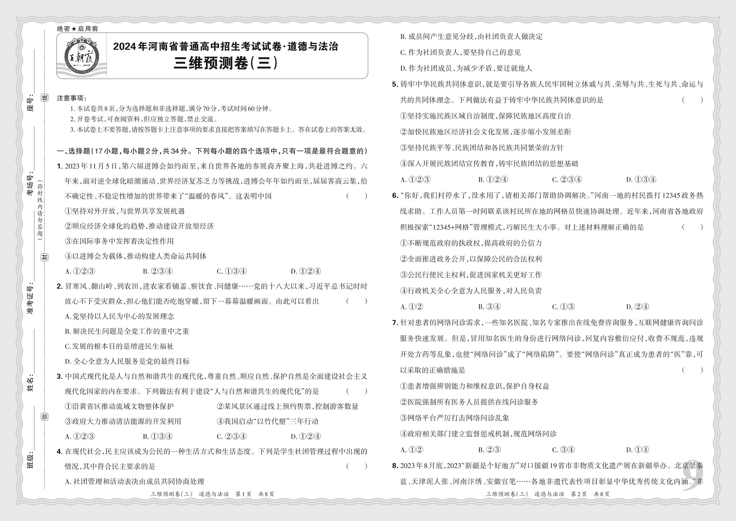 2024年河南省普通高中招生考试试卷·道德与法治 三维预测卷(三)