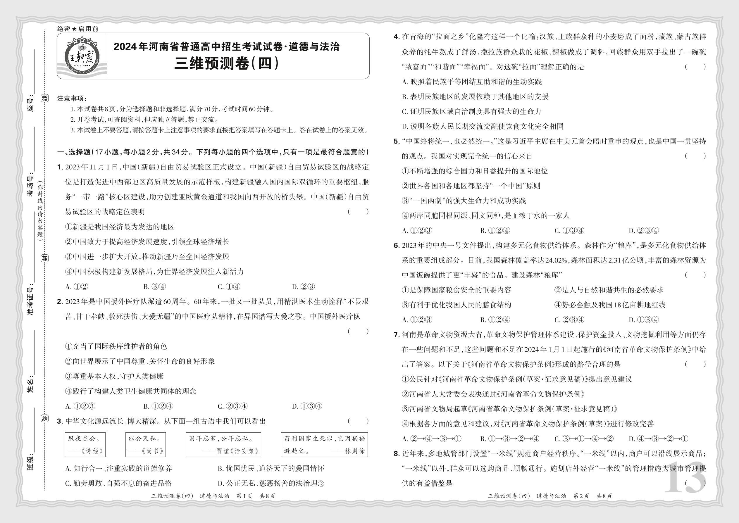 2024年河南省普通高中招生考试试卷·道德与法治 三维预测卷(四)