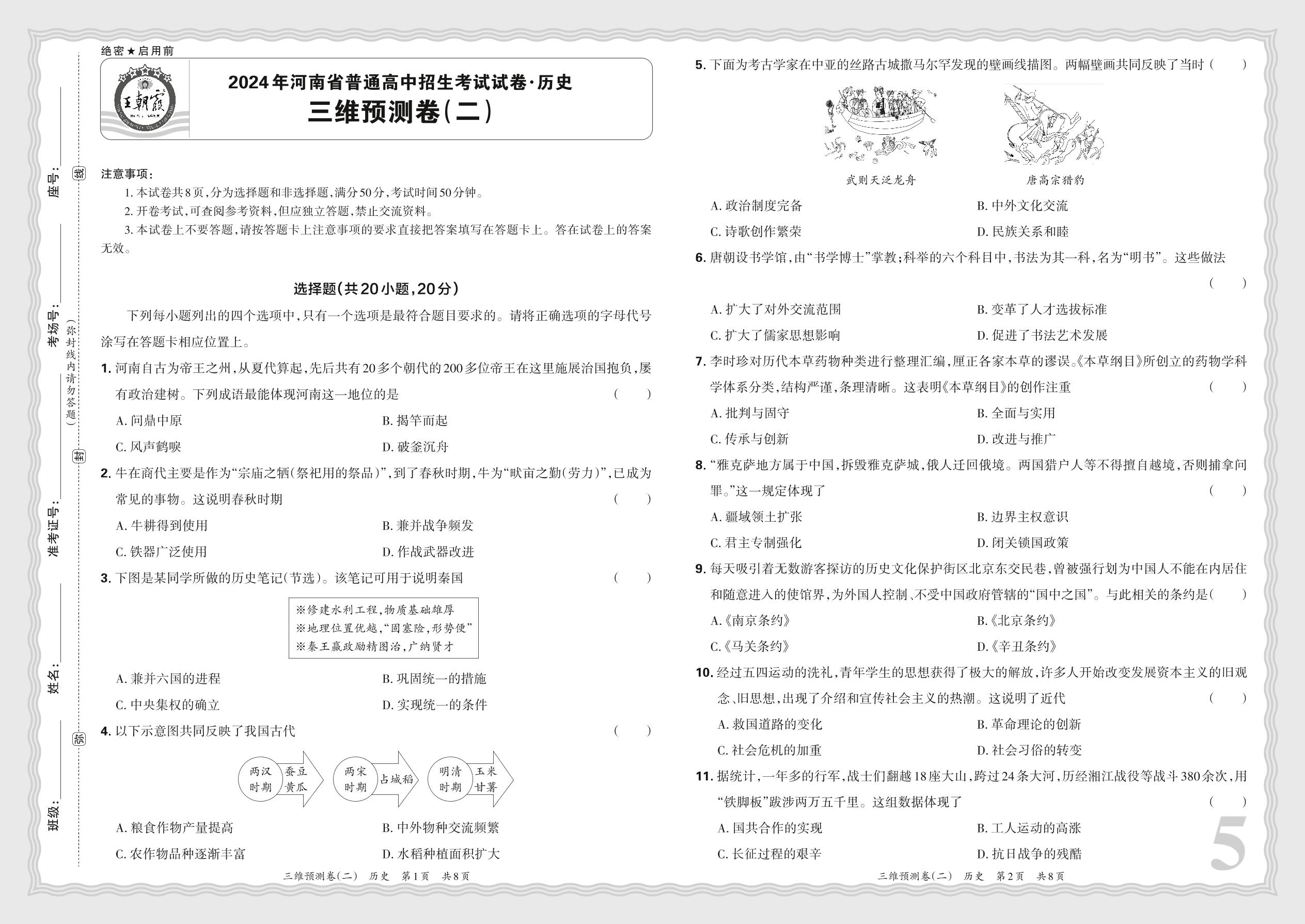 2024年河南省普通高中招生考试试卷·历史 三维预测卷(二)