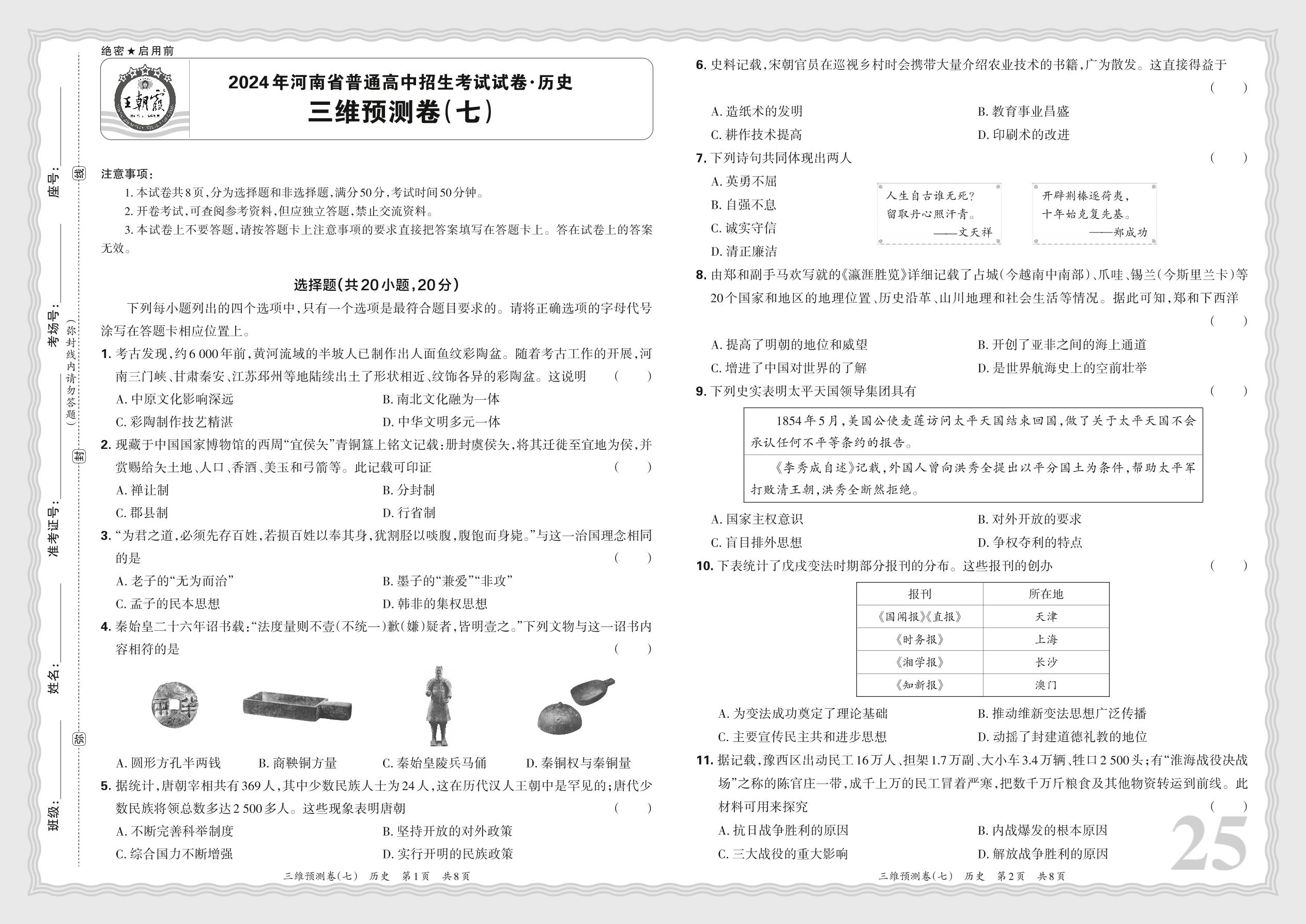 2024年河南省普通高中招生考试试卷·历史 三维预测卷(七)