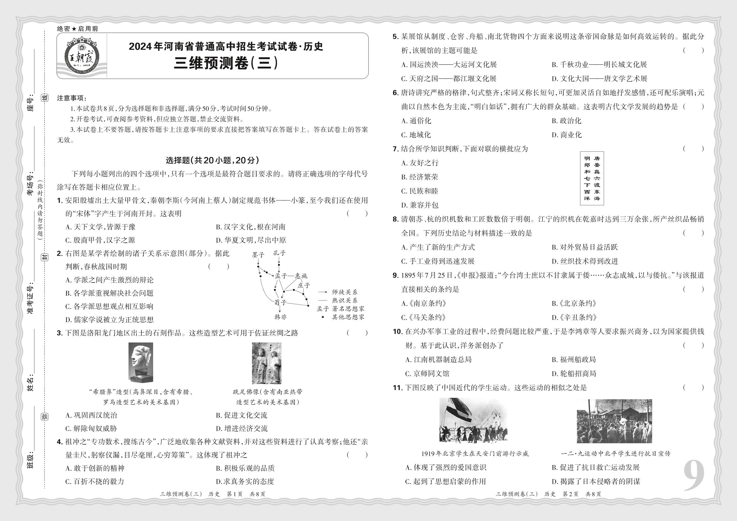 2024年河南省普通高中招生考试试卷·历史 三维预测卷(三)
