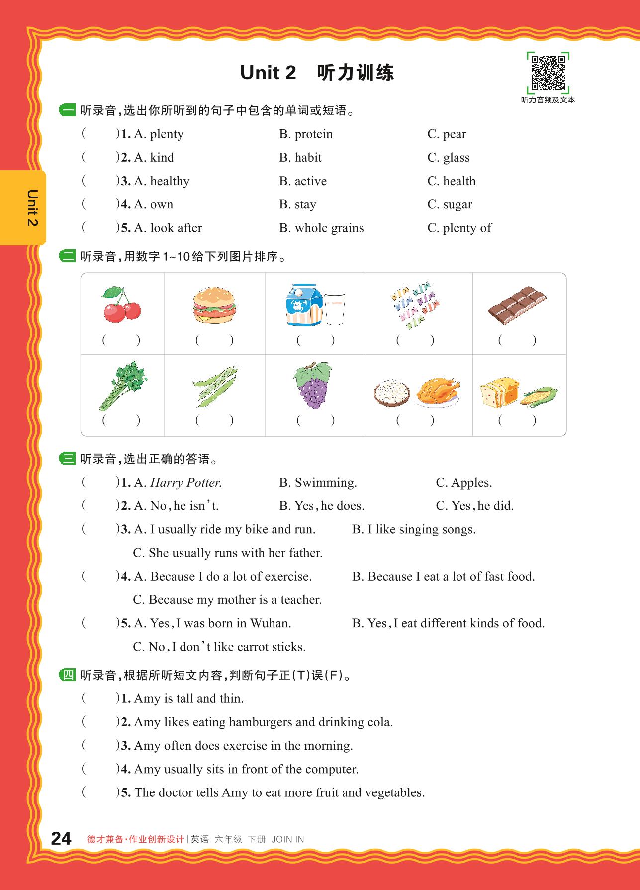 2024春下册六年级英语剑桥版 Unit 2 听力训练