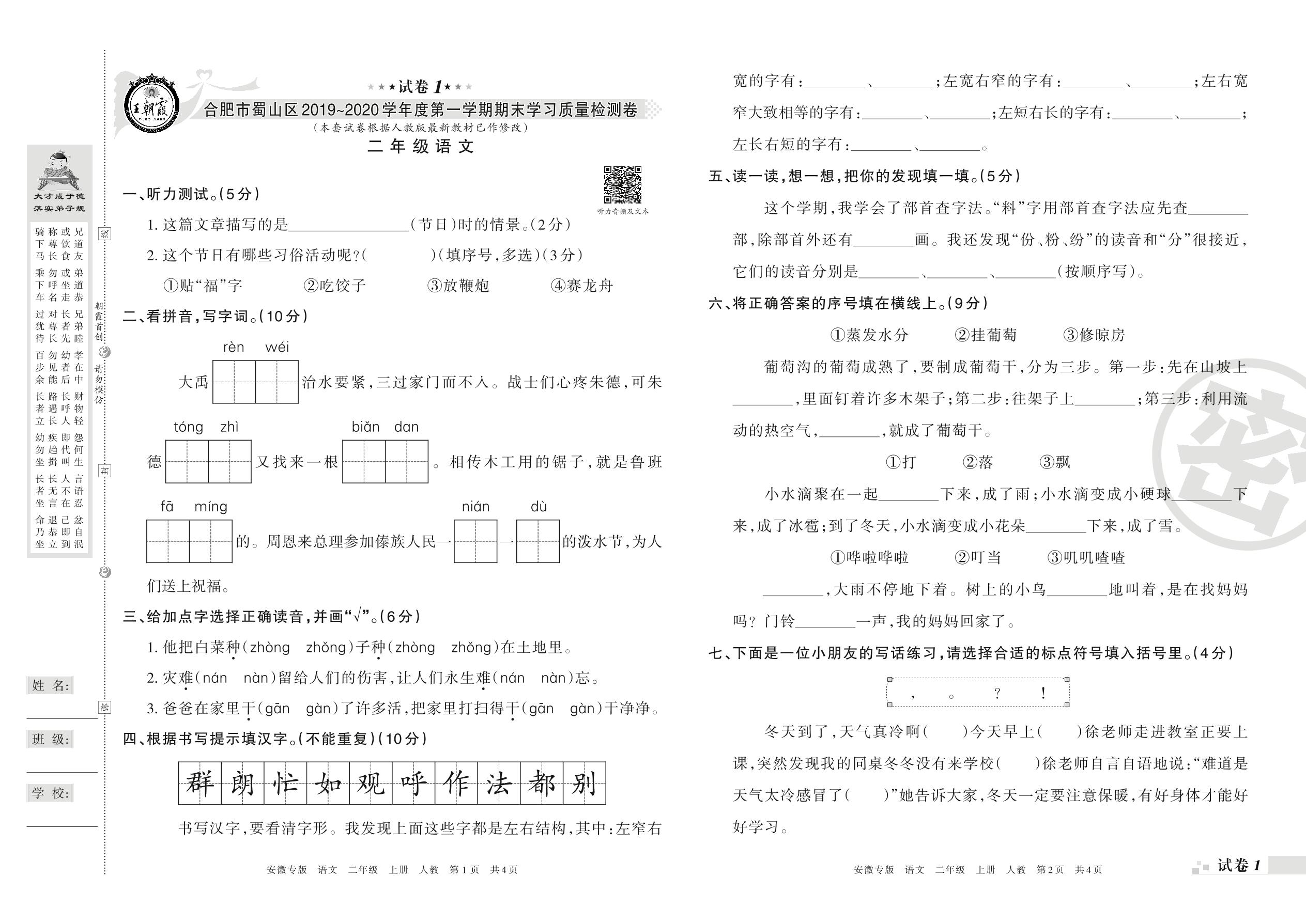 2019-2020学年第一学期合肥市蜀山区二年级语文试卷(人教版)【1】
