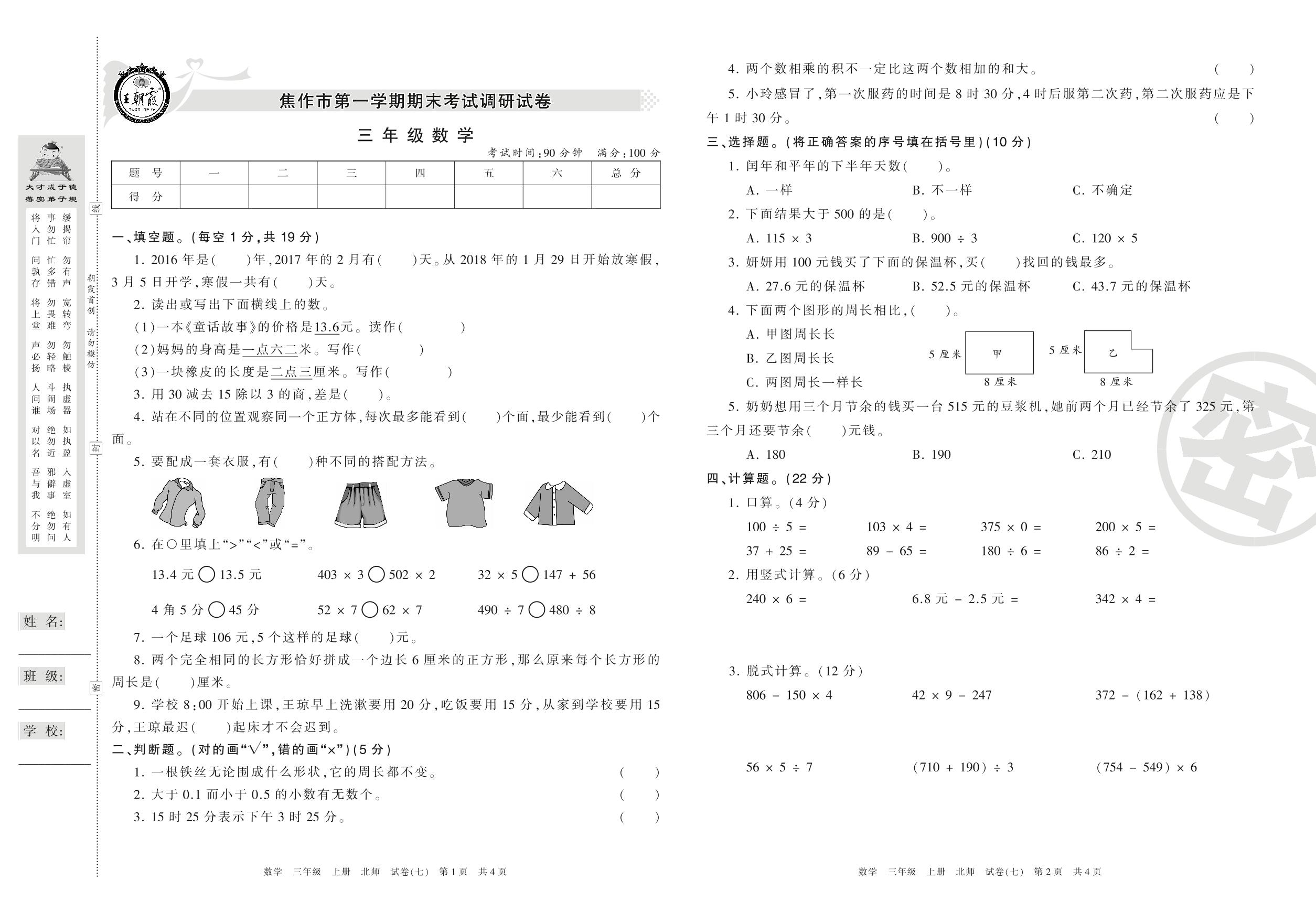 2016-2017学年第一学期焦作市三年级数学试卷(北师版)【7】