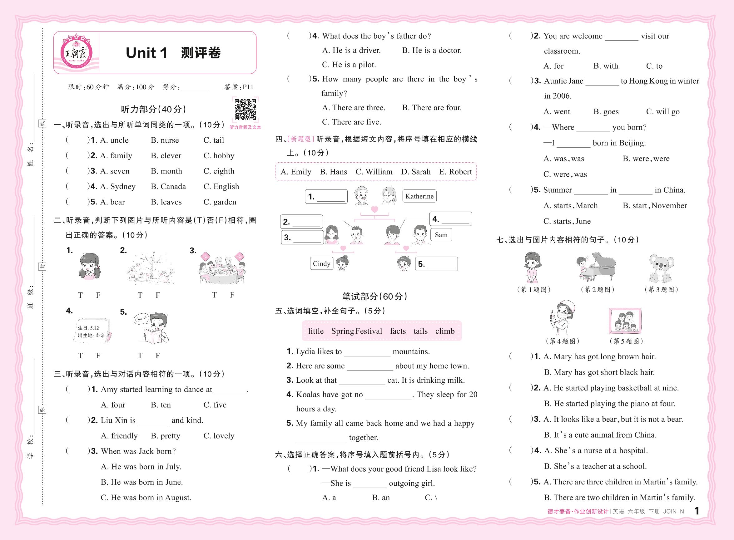 2024春下册六年级英语剑桥版 Unit 1 测评卷