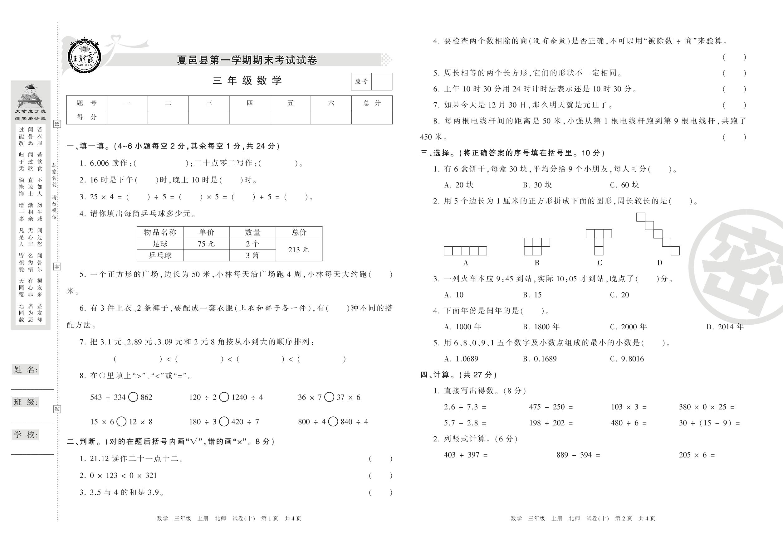 2016-2017学年第一学期商丘市夏邑县三年级数学试卷(北师版)【10】