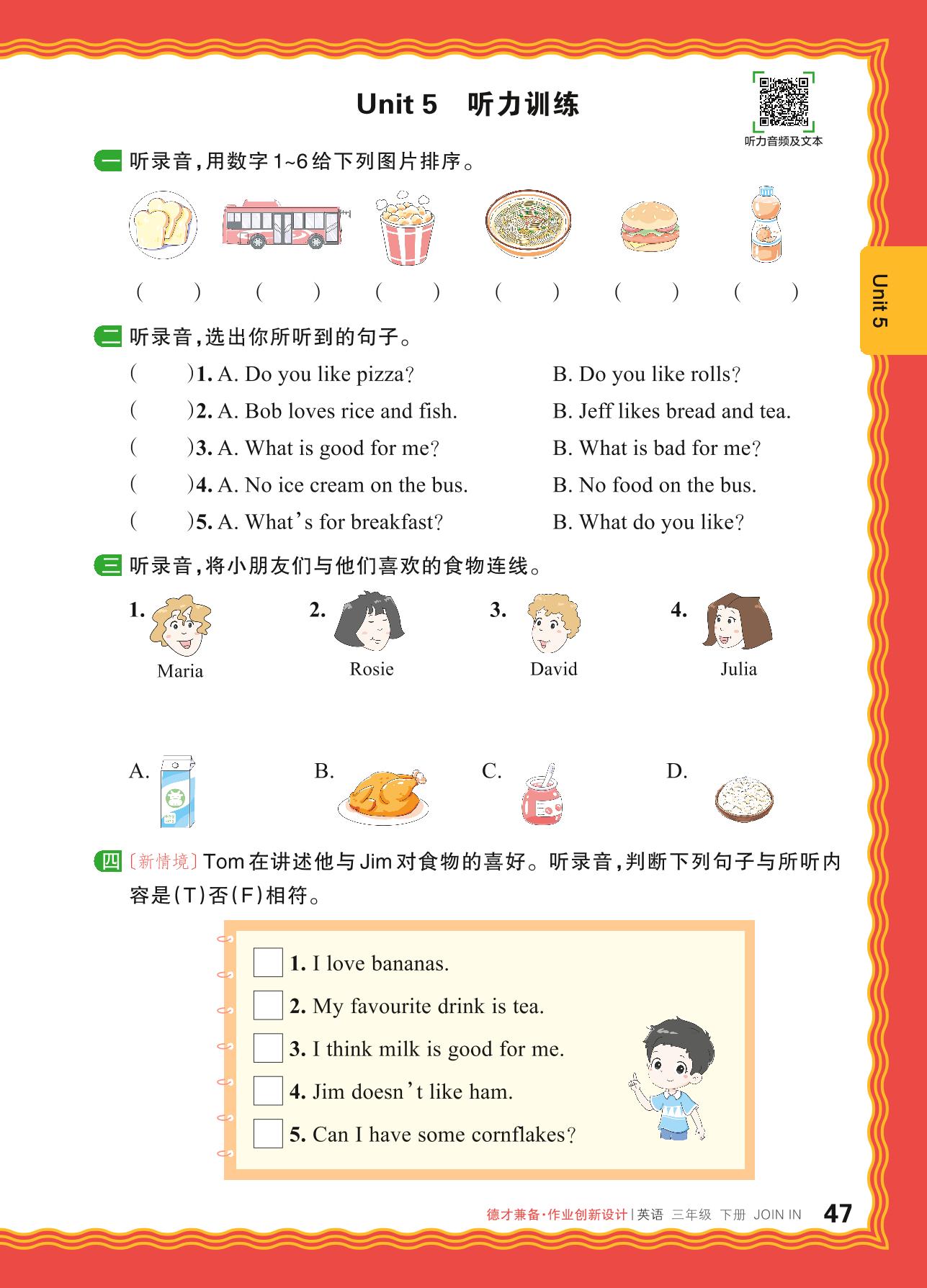 2024春下册三年级英语剑桥版 Unit 5 听力训练