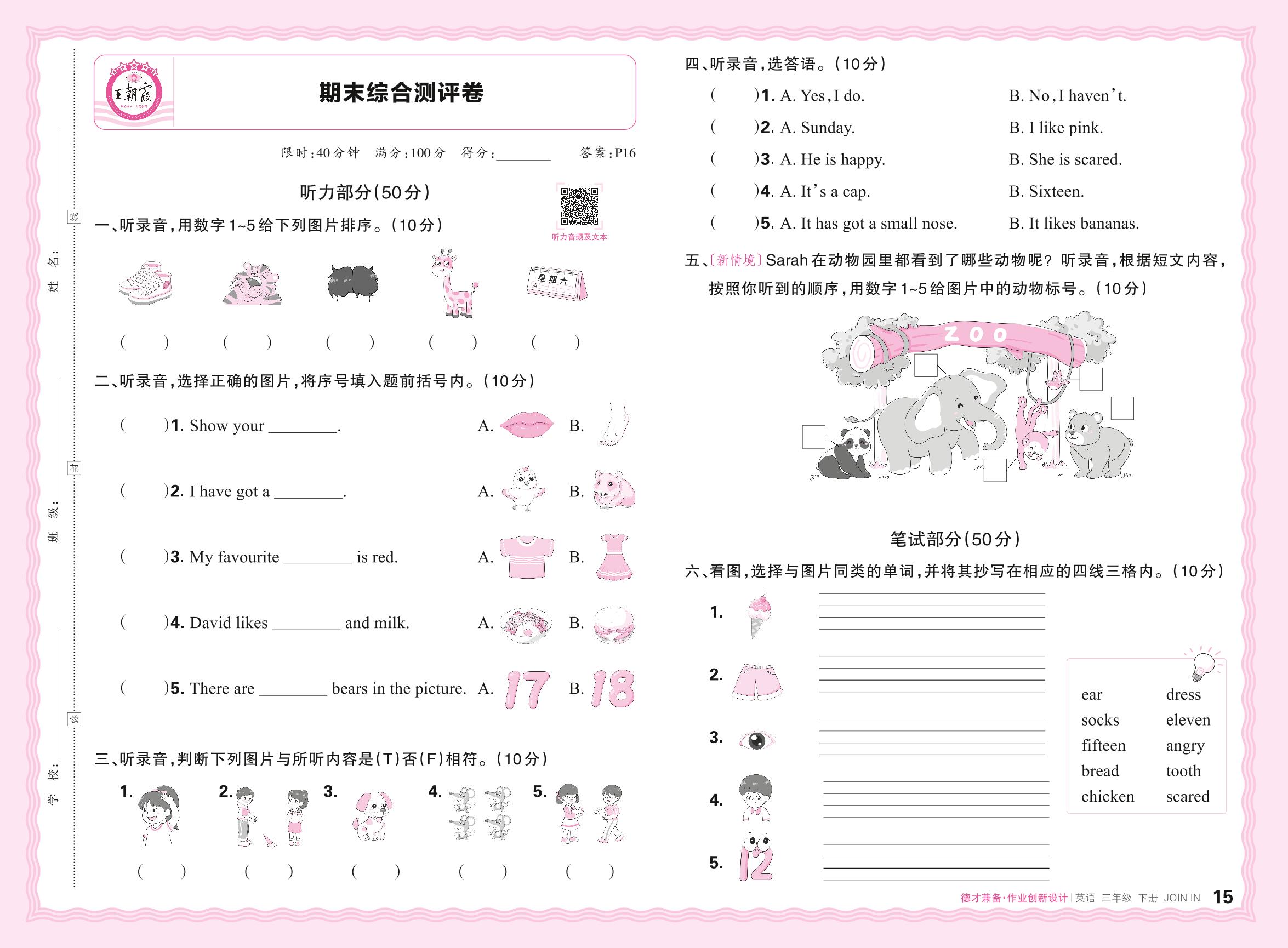 2024春下册三年级英语剑桥版 期末综合测评卷