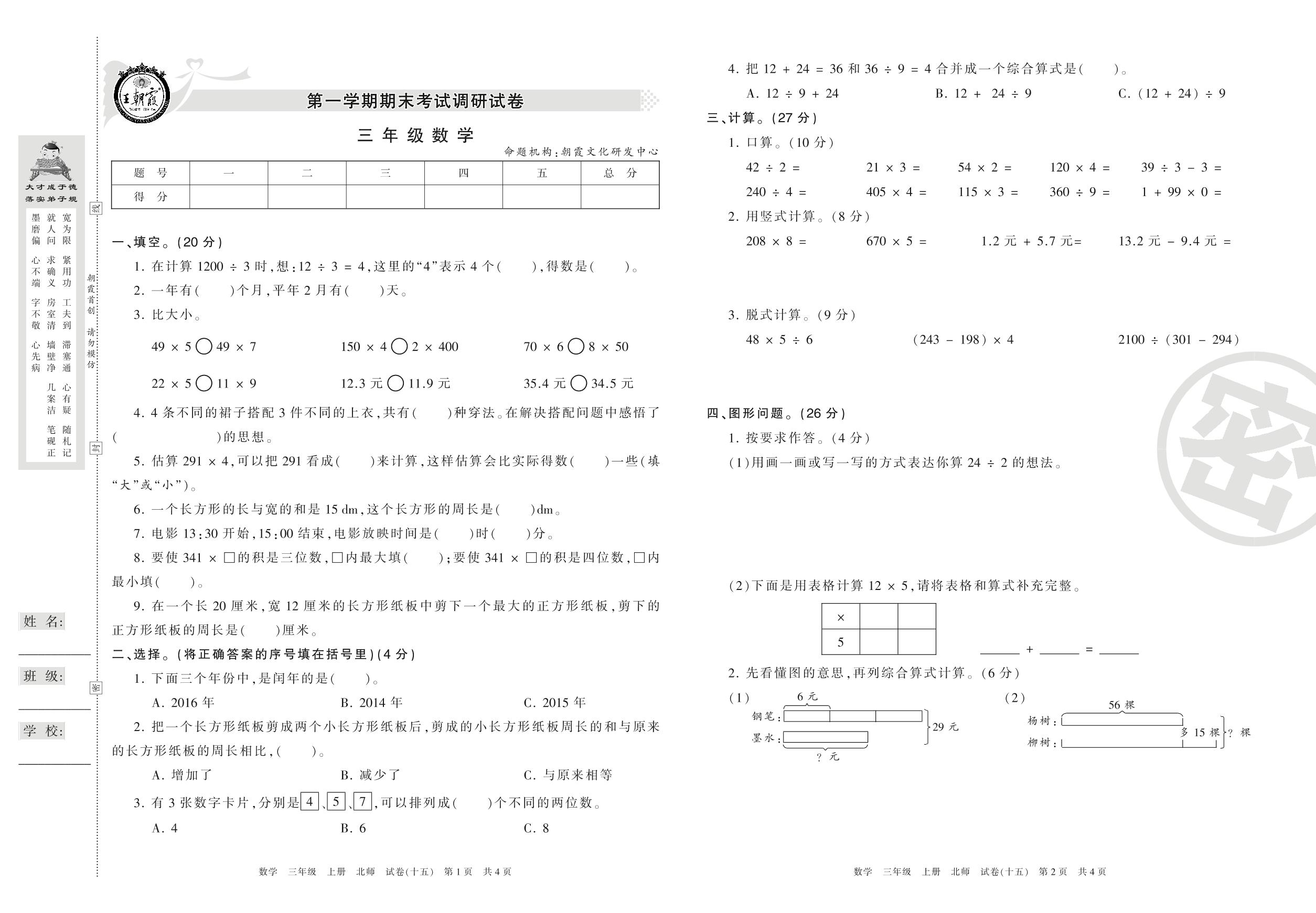 王朝霞期末调研卷三年级上册数学(北师版)【15】