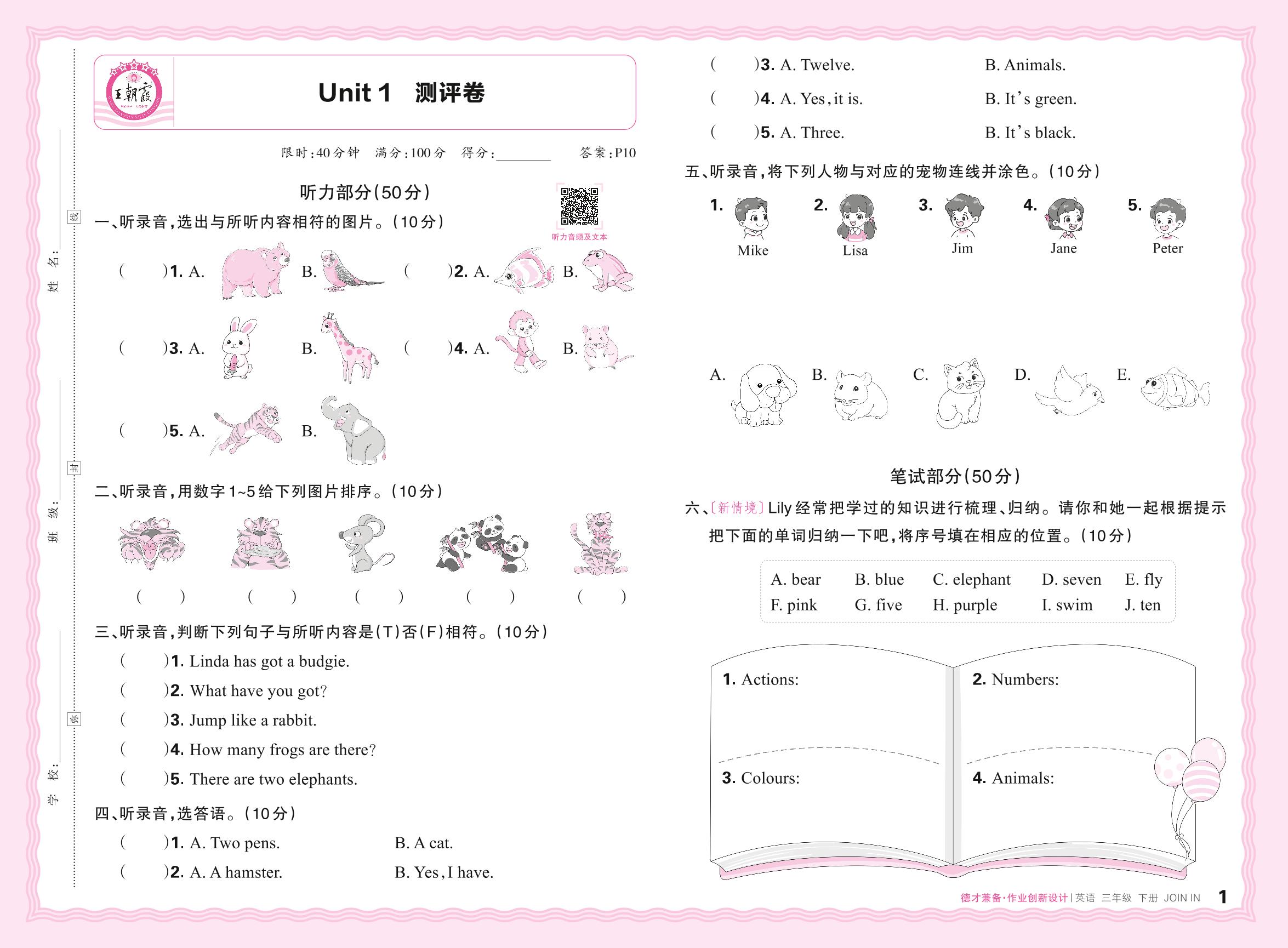 2024春下册三年级英语剑桥版 Unit 1 测评卷