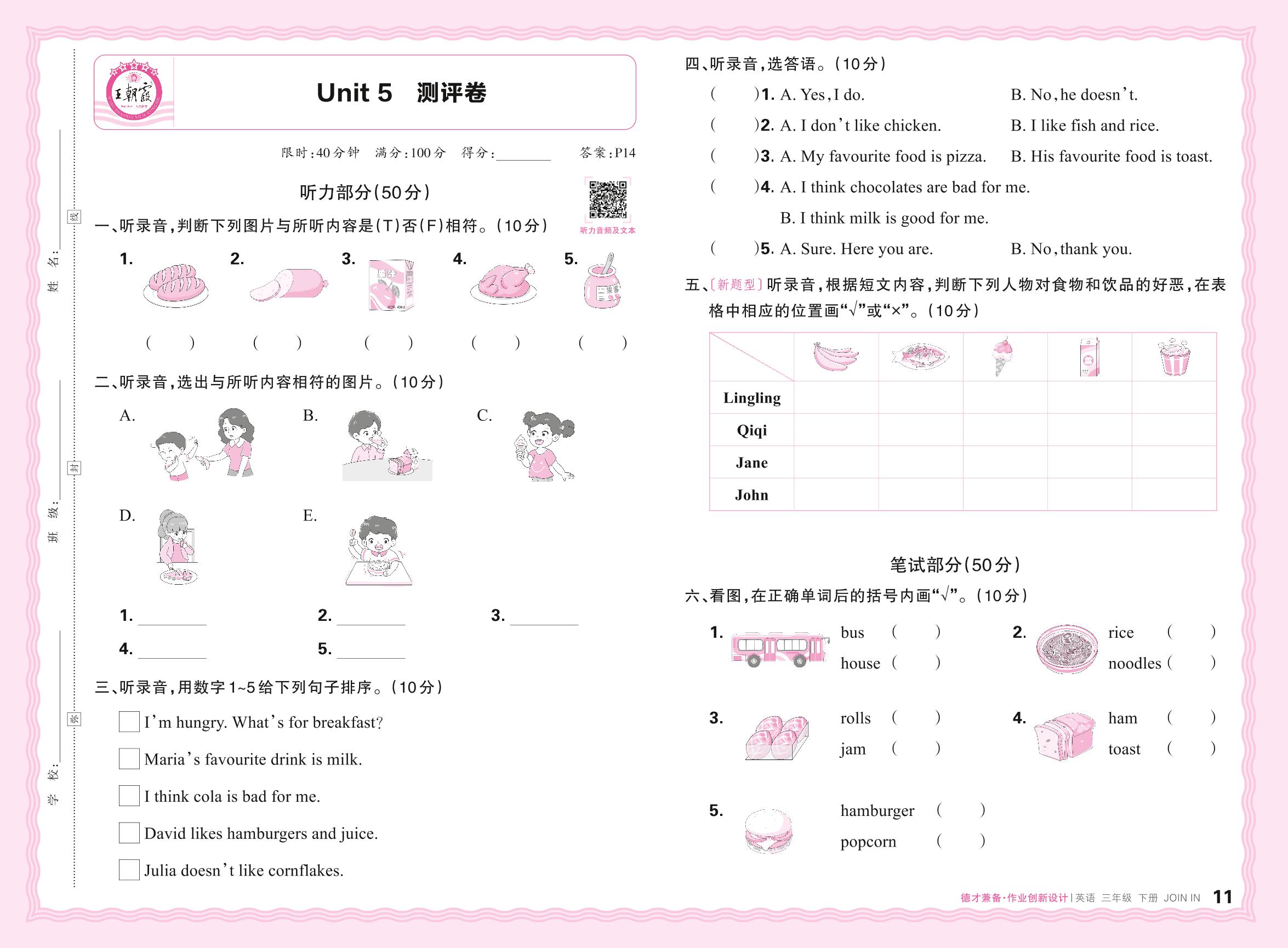 2024春下册三年级英语剑桥版 Unit 5 测评卷