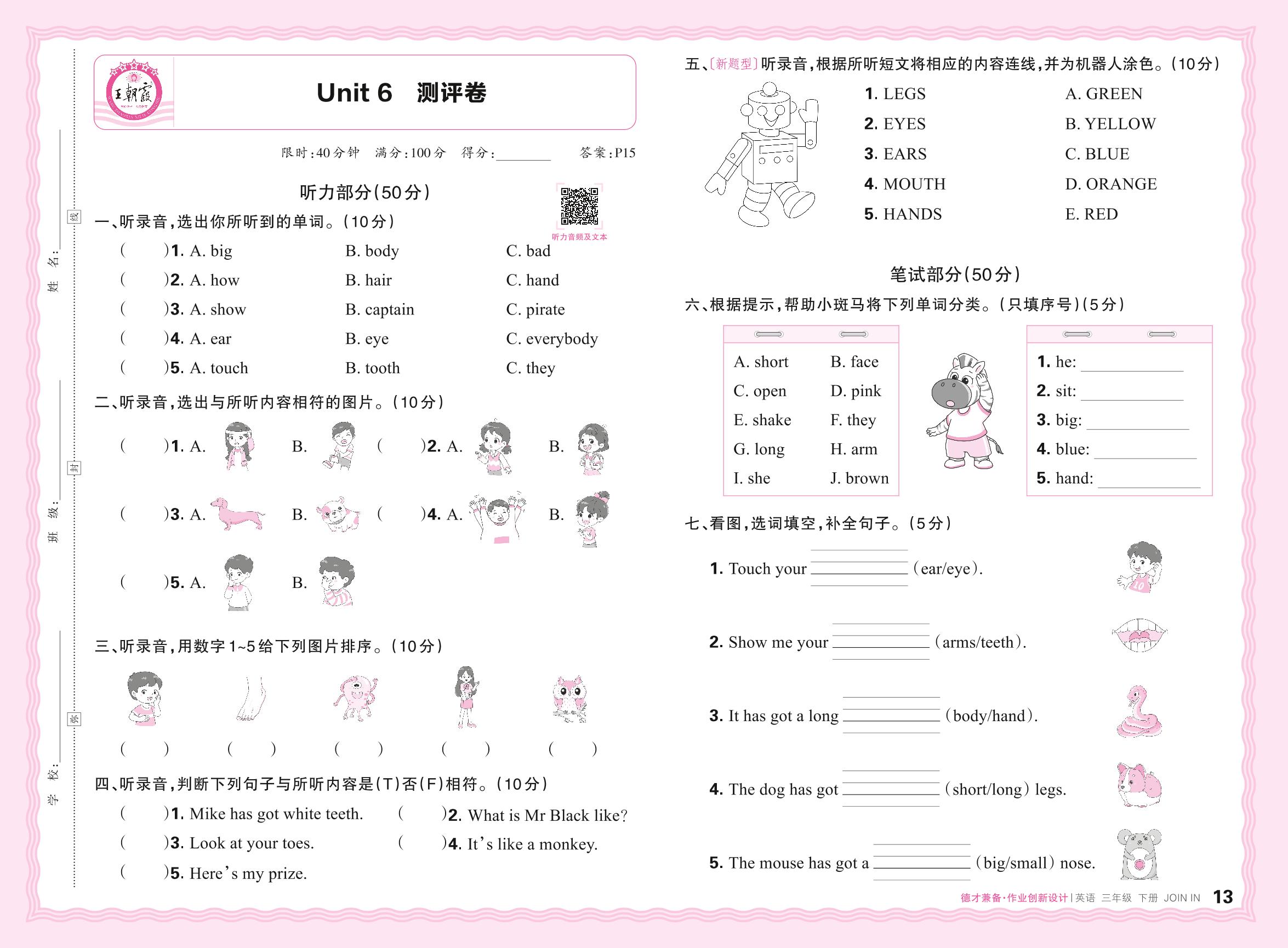 2024春下册三年级英语剑桥版 Unit 6 测评卷